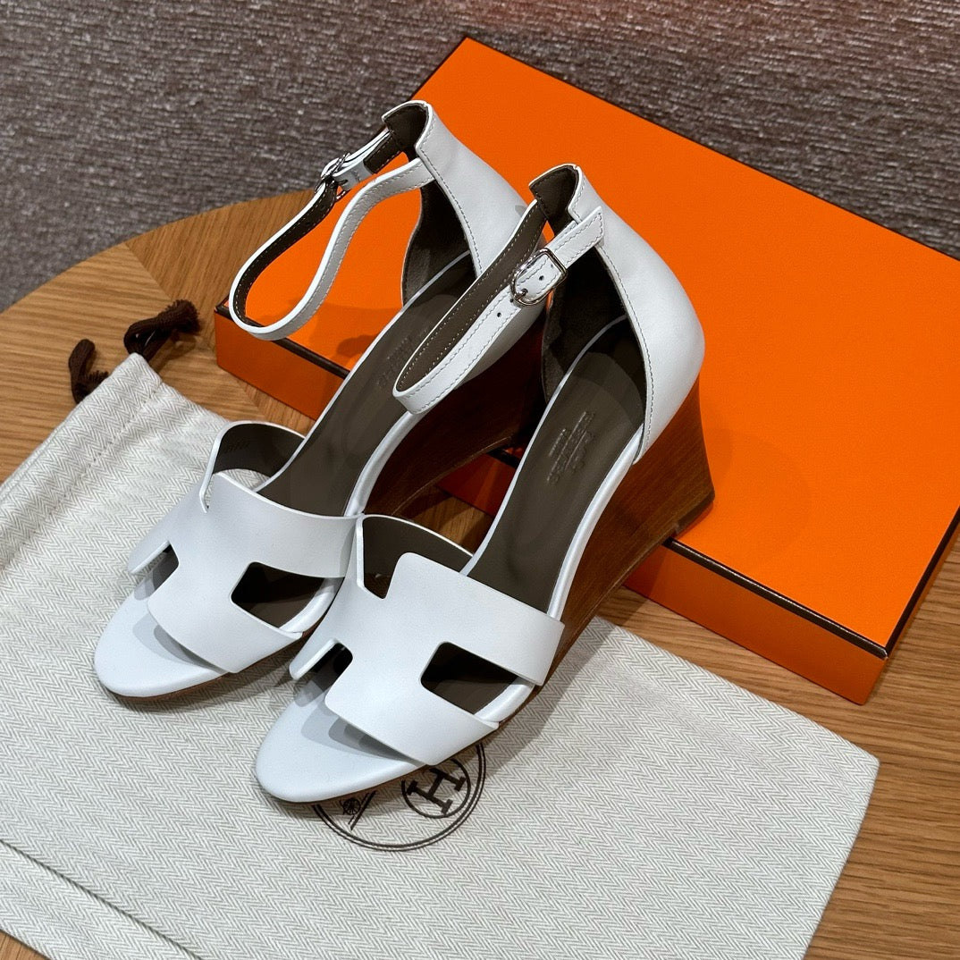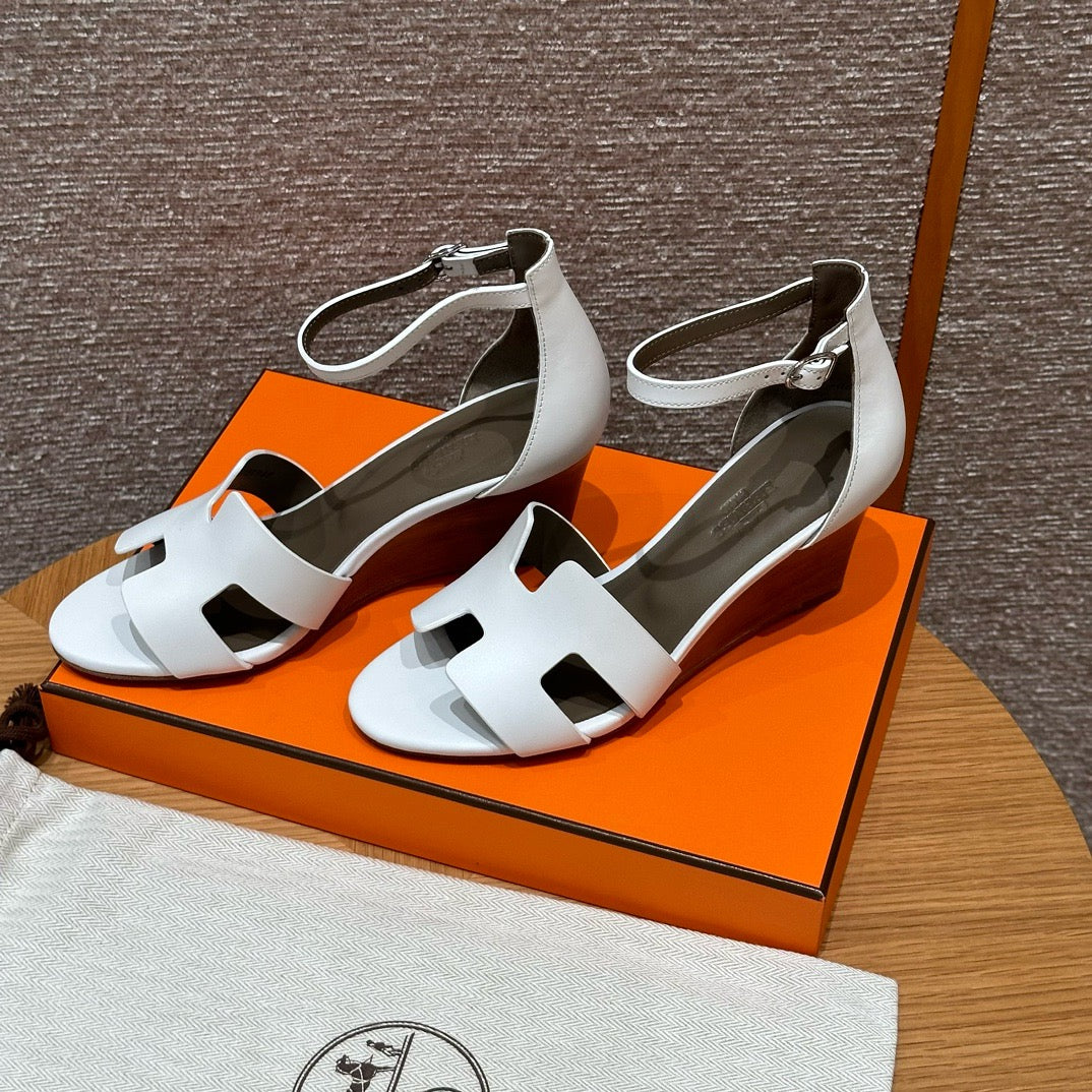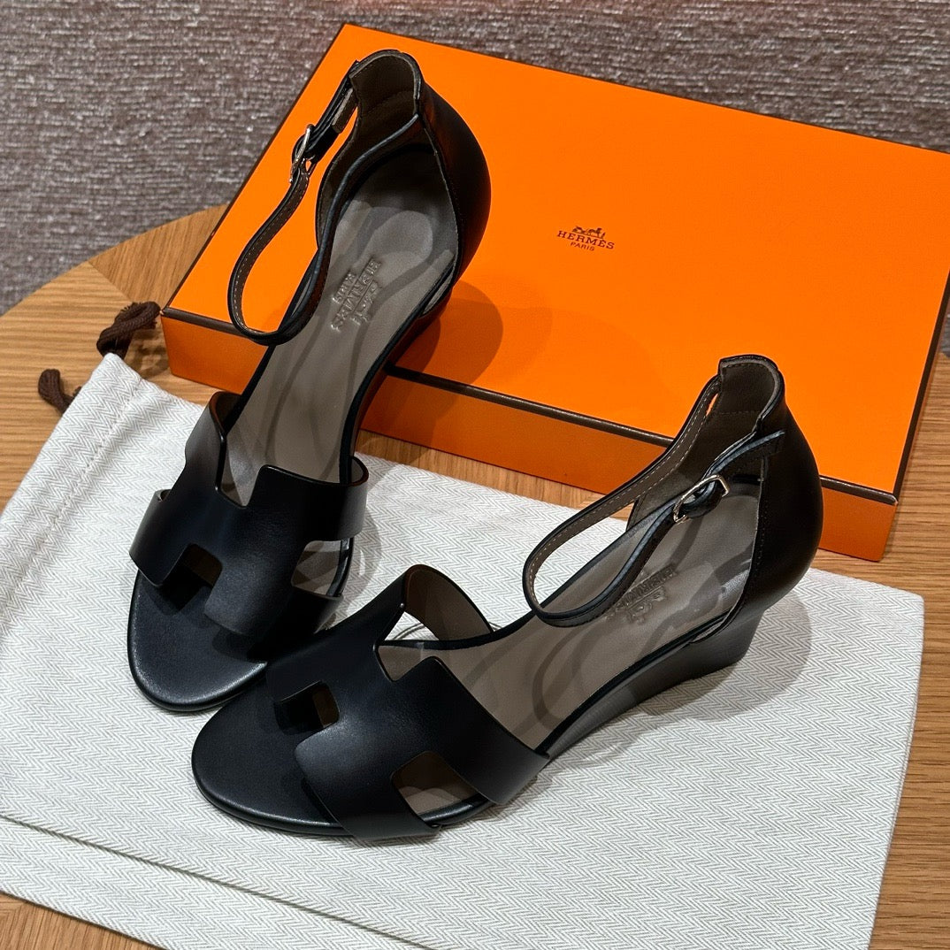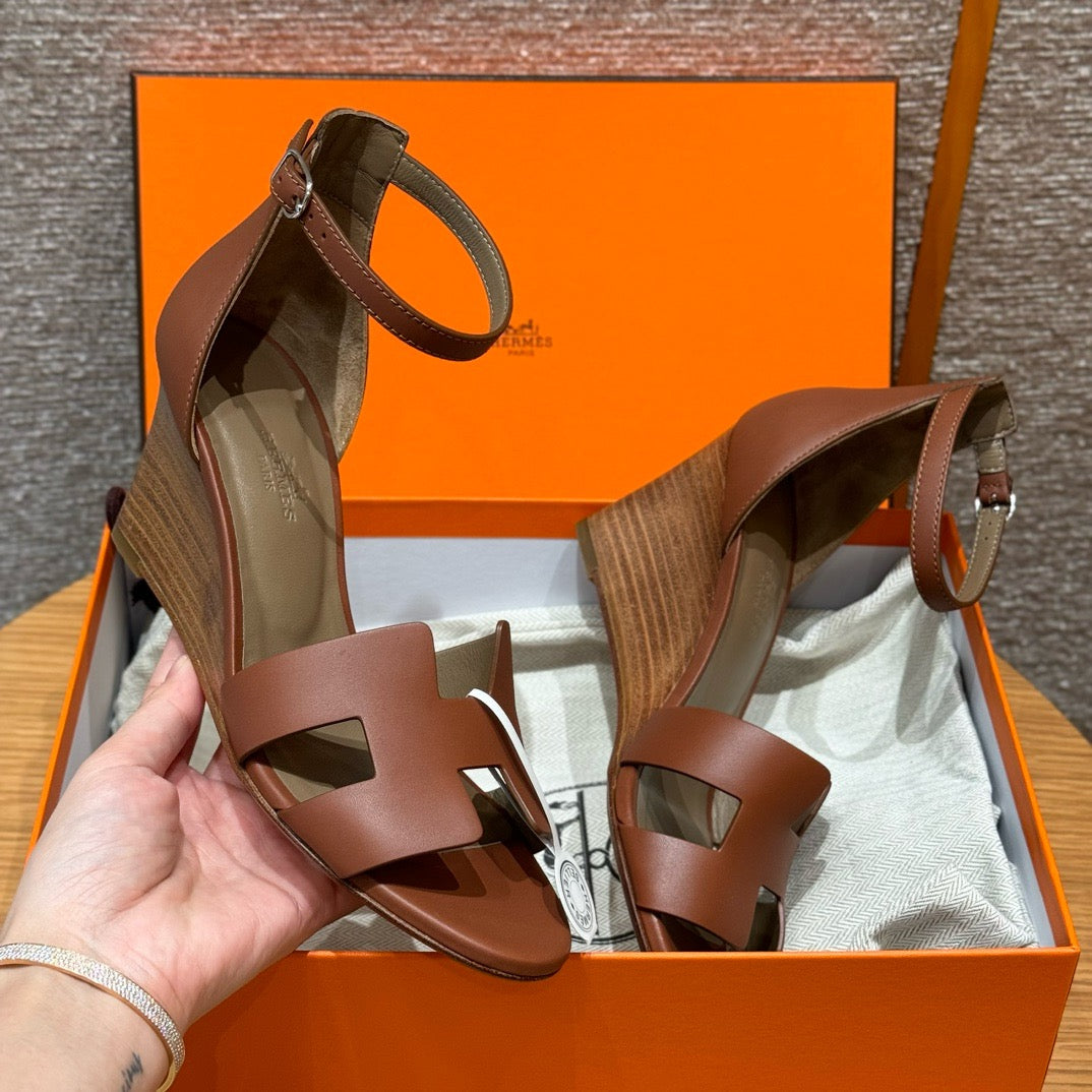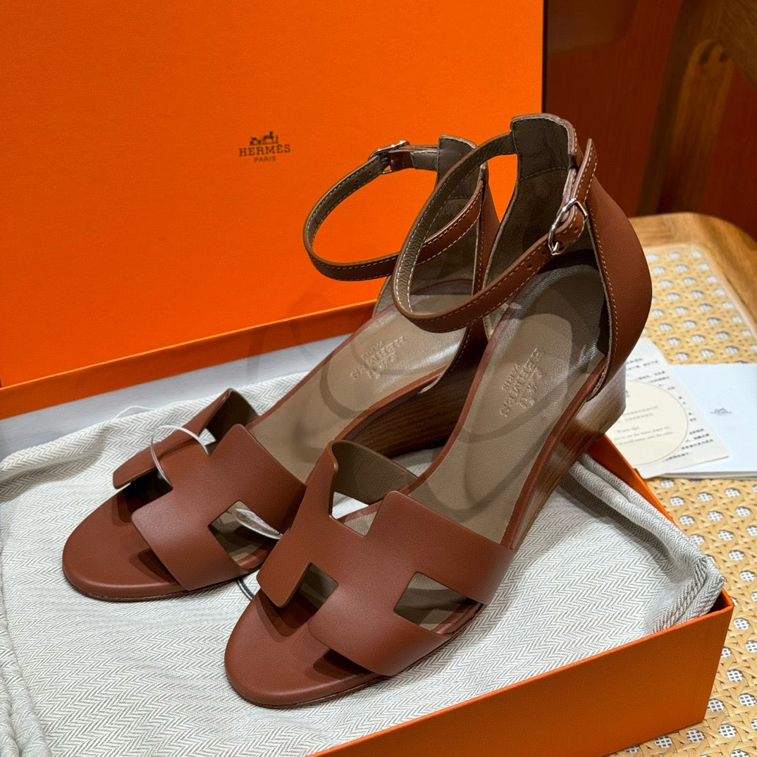발등을 감싸는 H 모양 컷아웃 스트랩은 에르메스의 아이코닉한 디자인 요소로, 심플하면서도 브랜드 아이덴티티를 강조합니다. 웨지 힐 구조가 다리를 길어 보이게 하면서도 편안한 착화를 제공합니다.