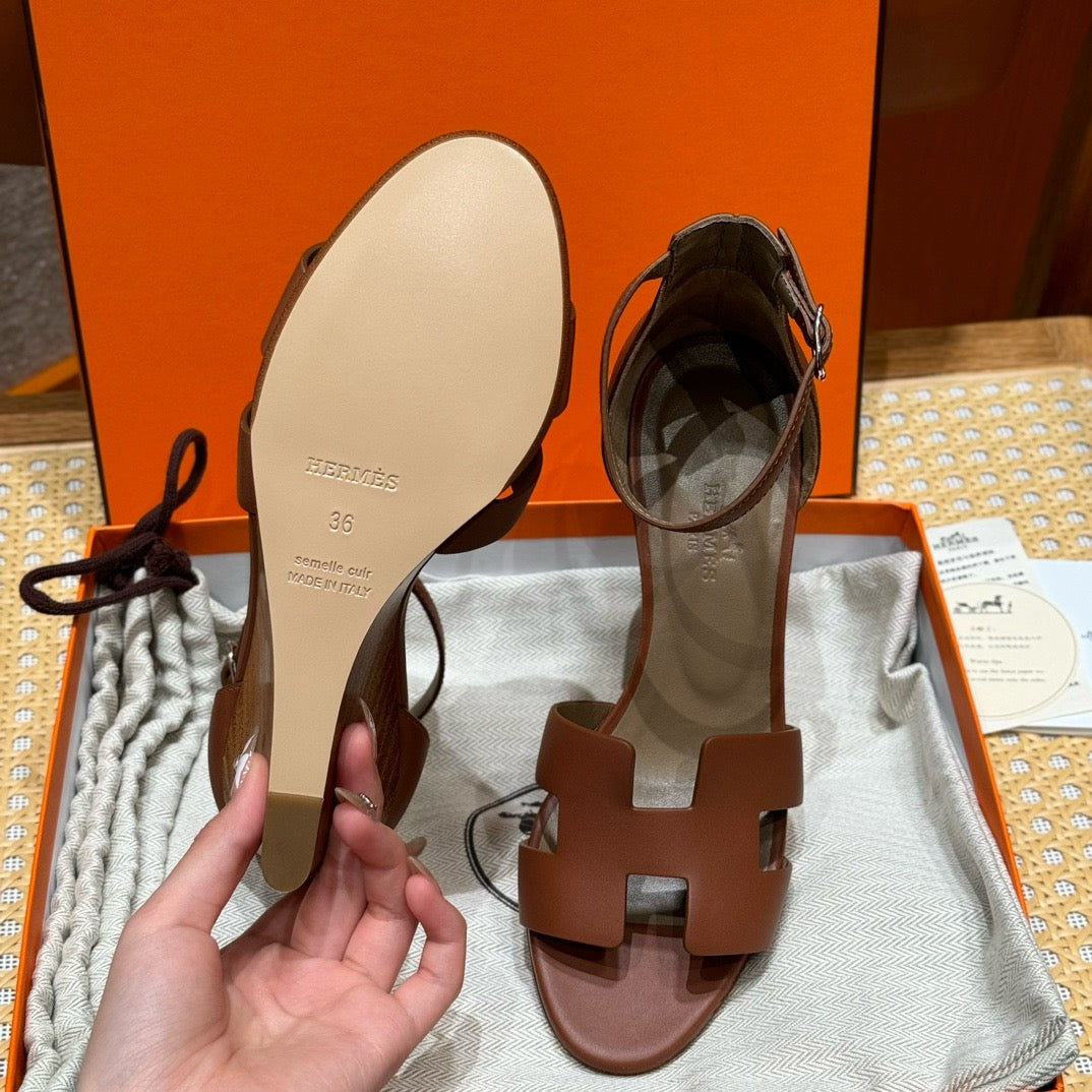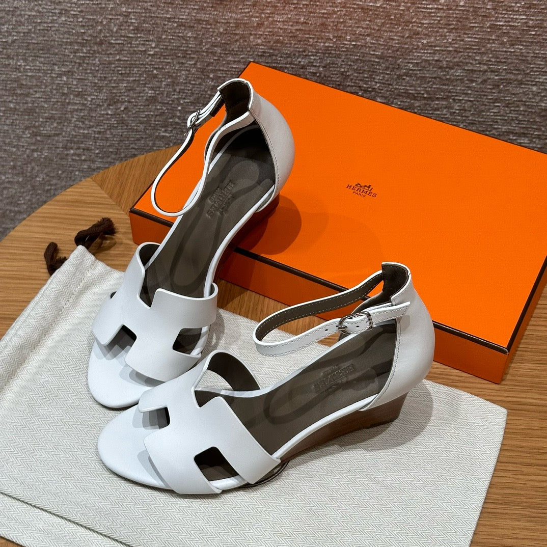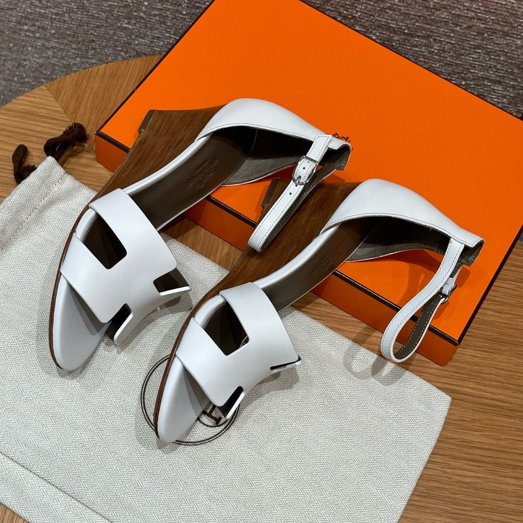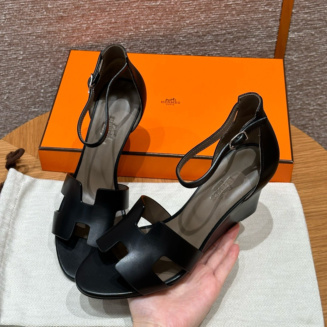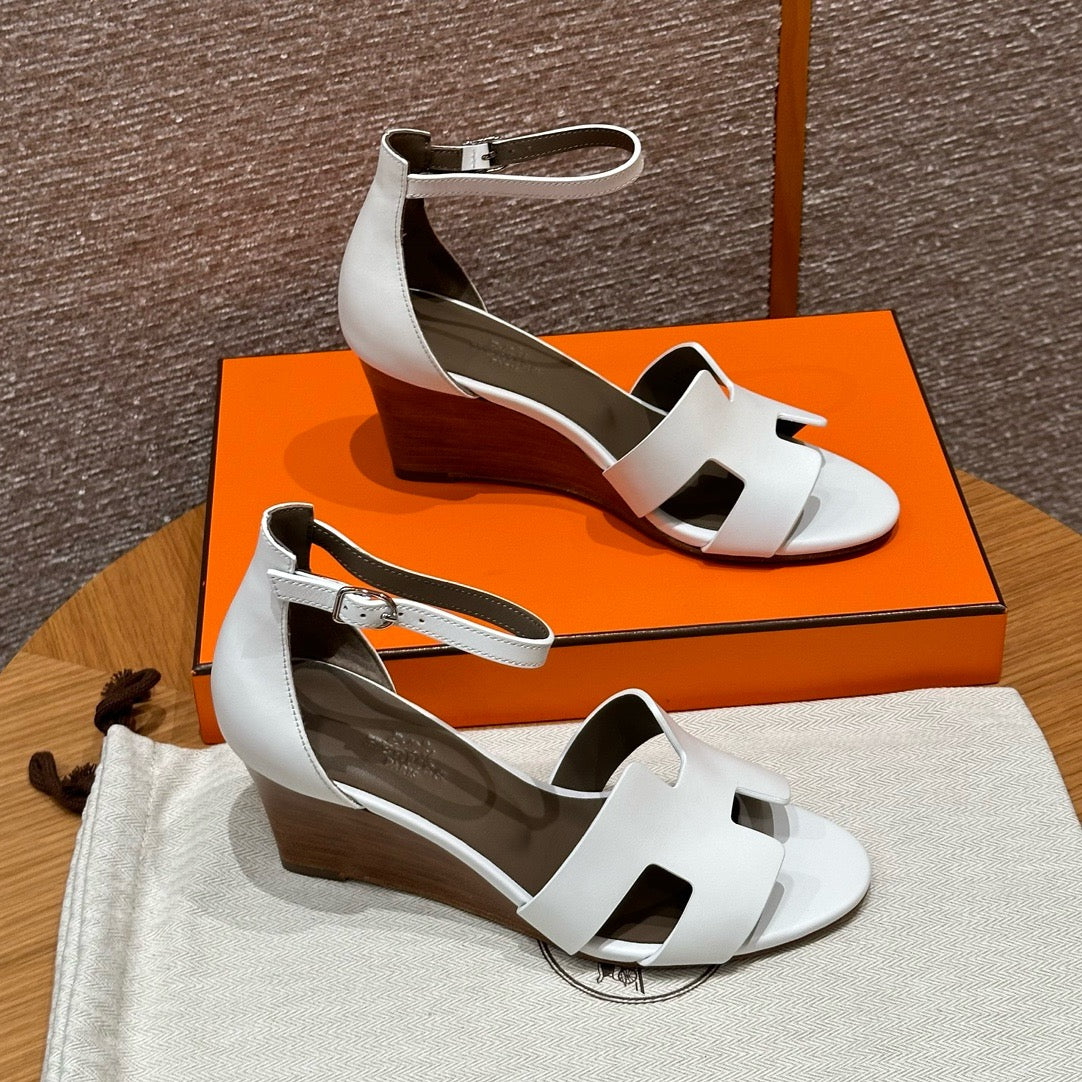 발등을 감싸는 H 모양 컷아웃 스트랩은 에르메스의 아이코닉한 디자인 요소로, 심플하면서도 브랜드 아이덴티티를 강조합니다. 웨지 힐 구조가 다리를 길어 보이게 하면서도 편안한 착화를 제공합니다.