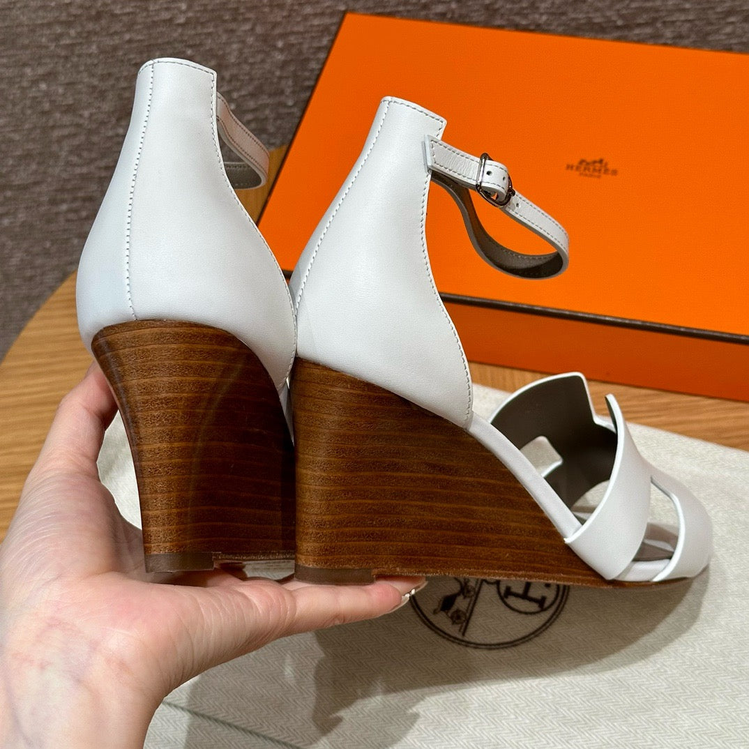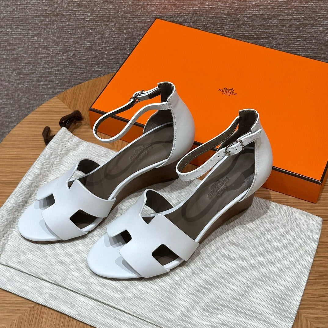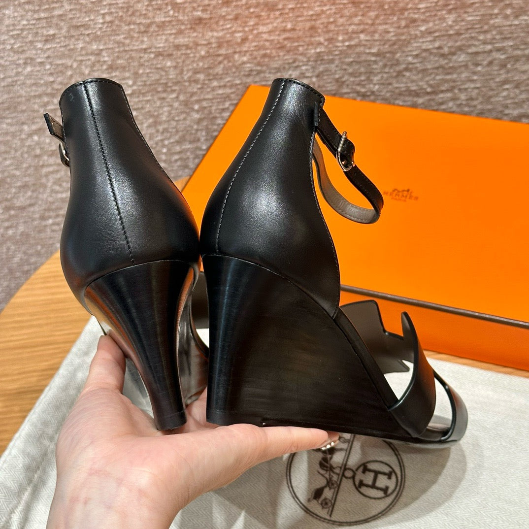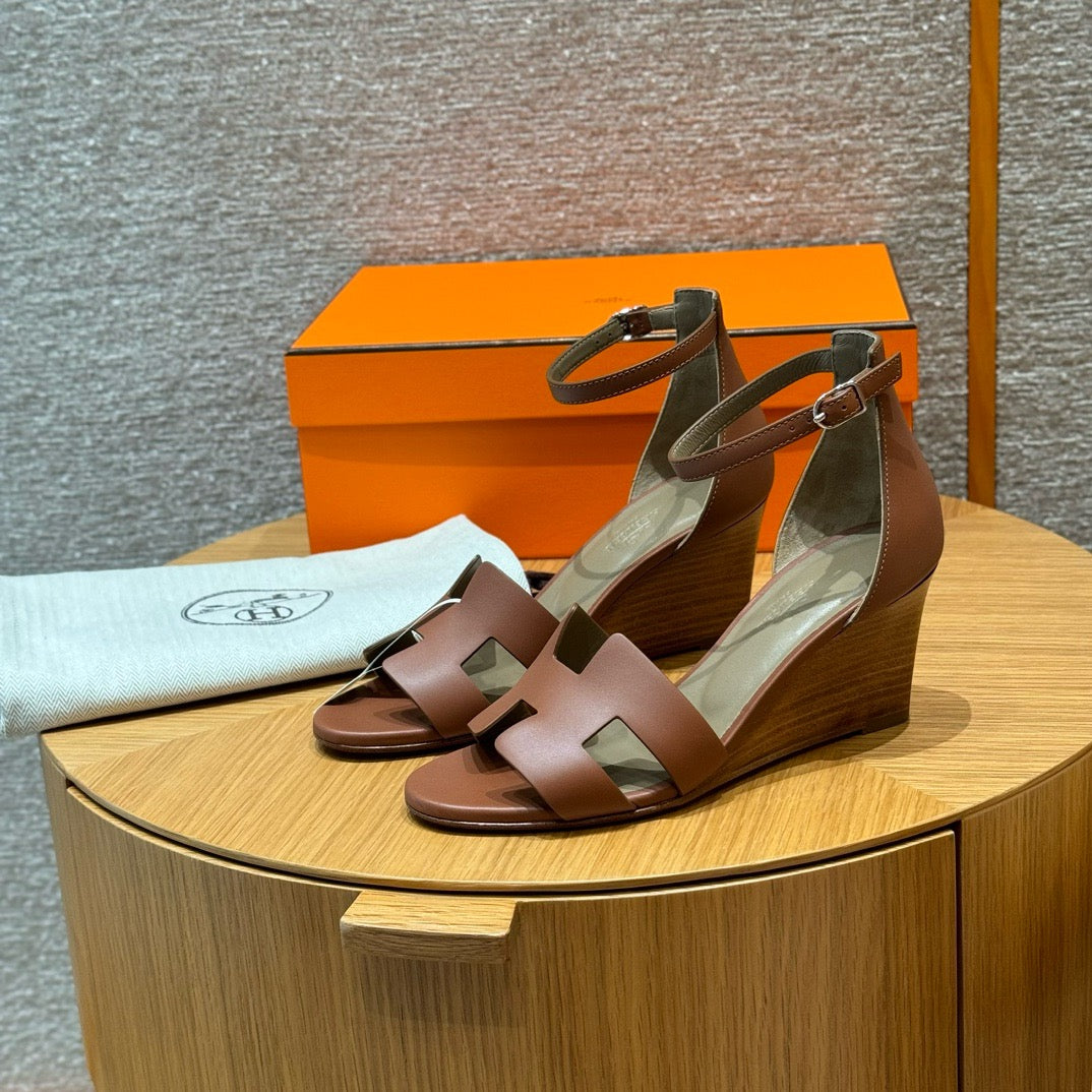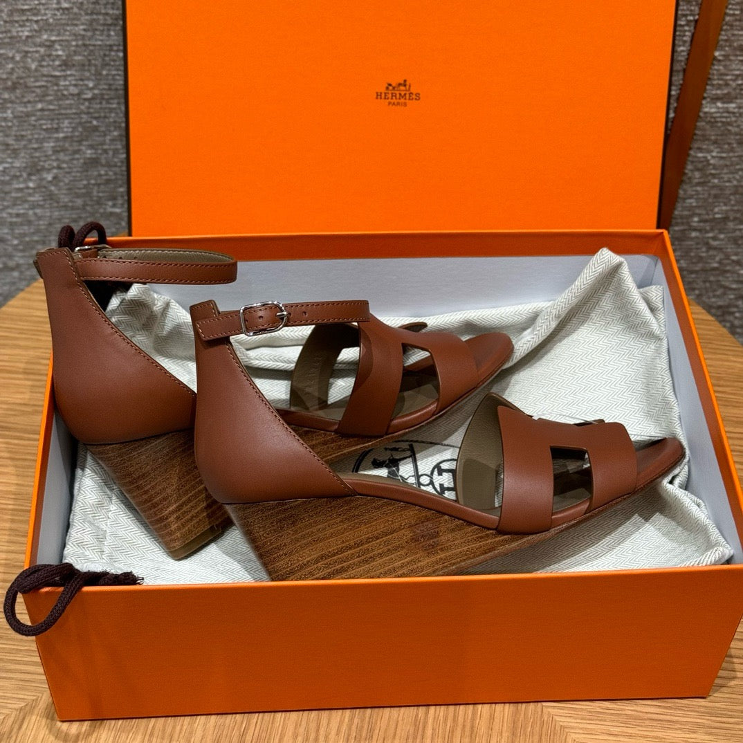 발등을 감싸는 H 모양 컷아웃 스트랩은 에르메스의 아이코닉한 디자인 요소로, 심플하면서도 브랜드 아이덴티티를 강조합니다. 웨지 힐 구조가 다리를 길어 보이게 하면서도 편안한 착화를 제공합니다.