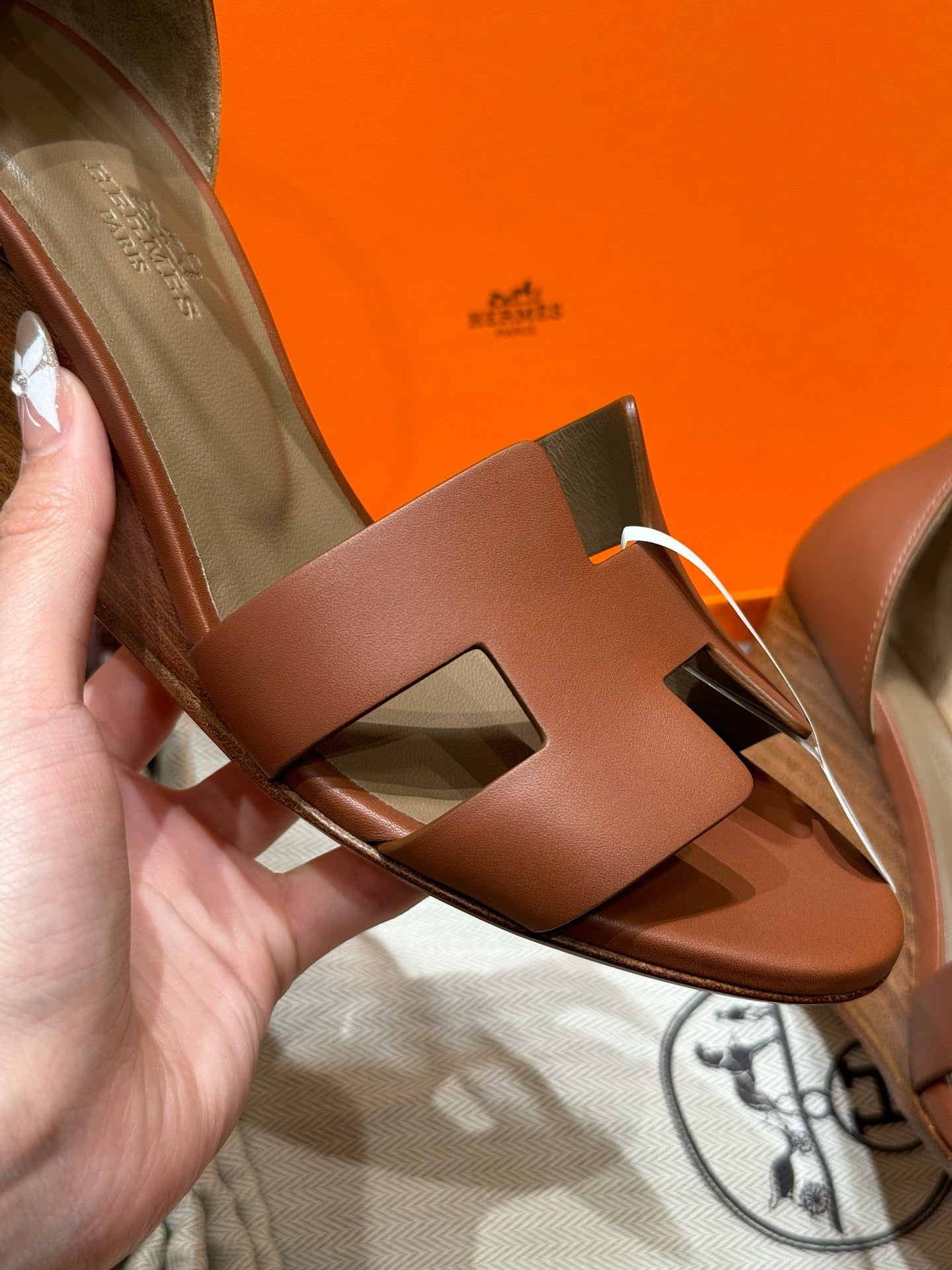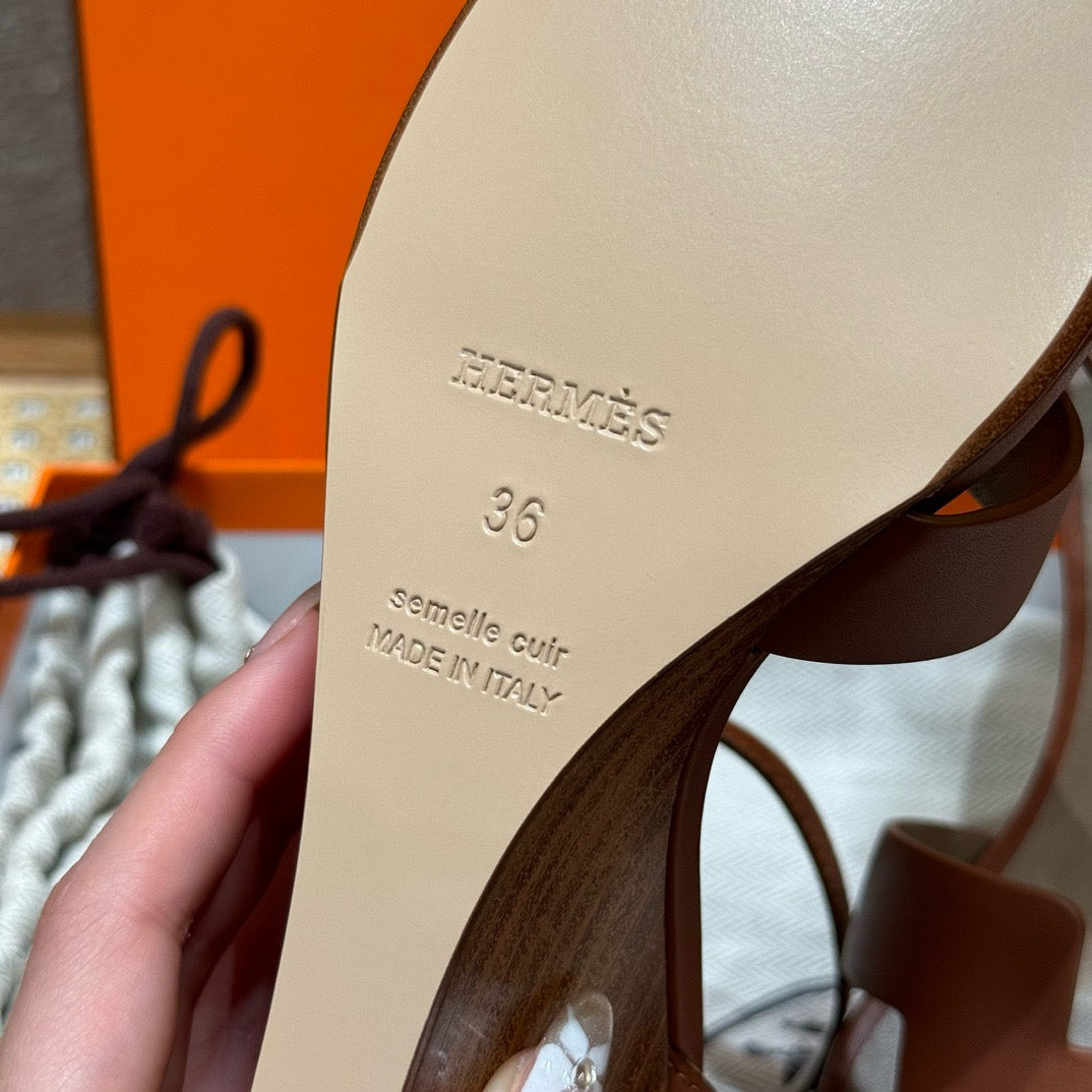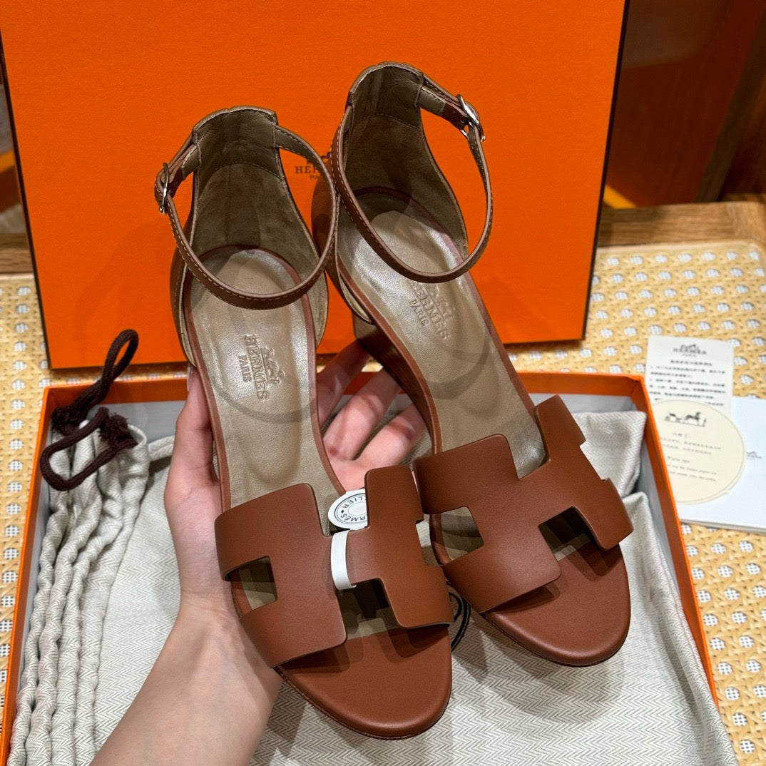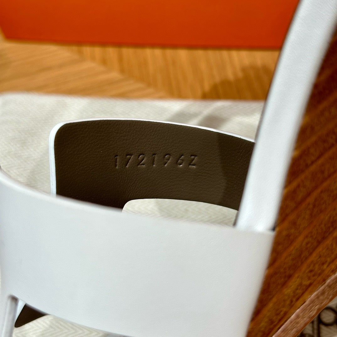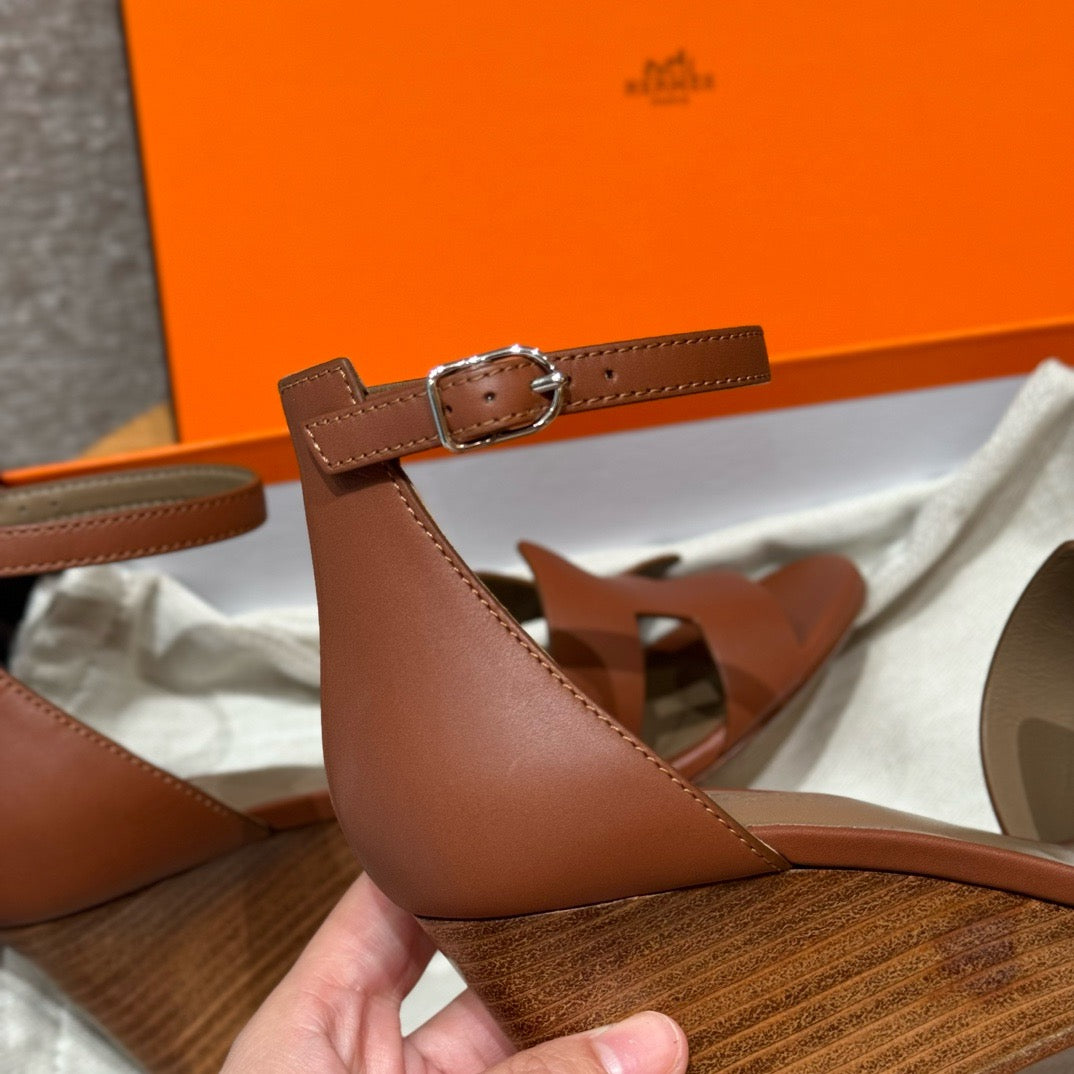 발등을 감싸는 H 모양 컷아웃 스트랩은 에르메스의 아이코닉한 디자인 요소로, 심플하면서도 브랜드 아이덴티티를 강조합니다. 웨지 힐 구조가 다리를 길어 보이게 하면서도 편안한 착화를 제공합니다.