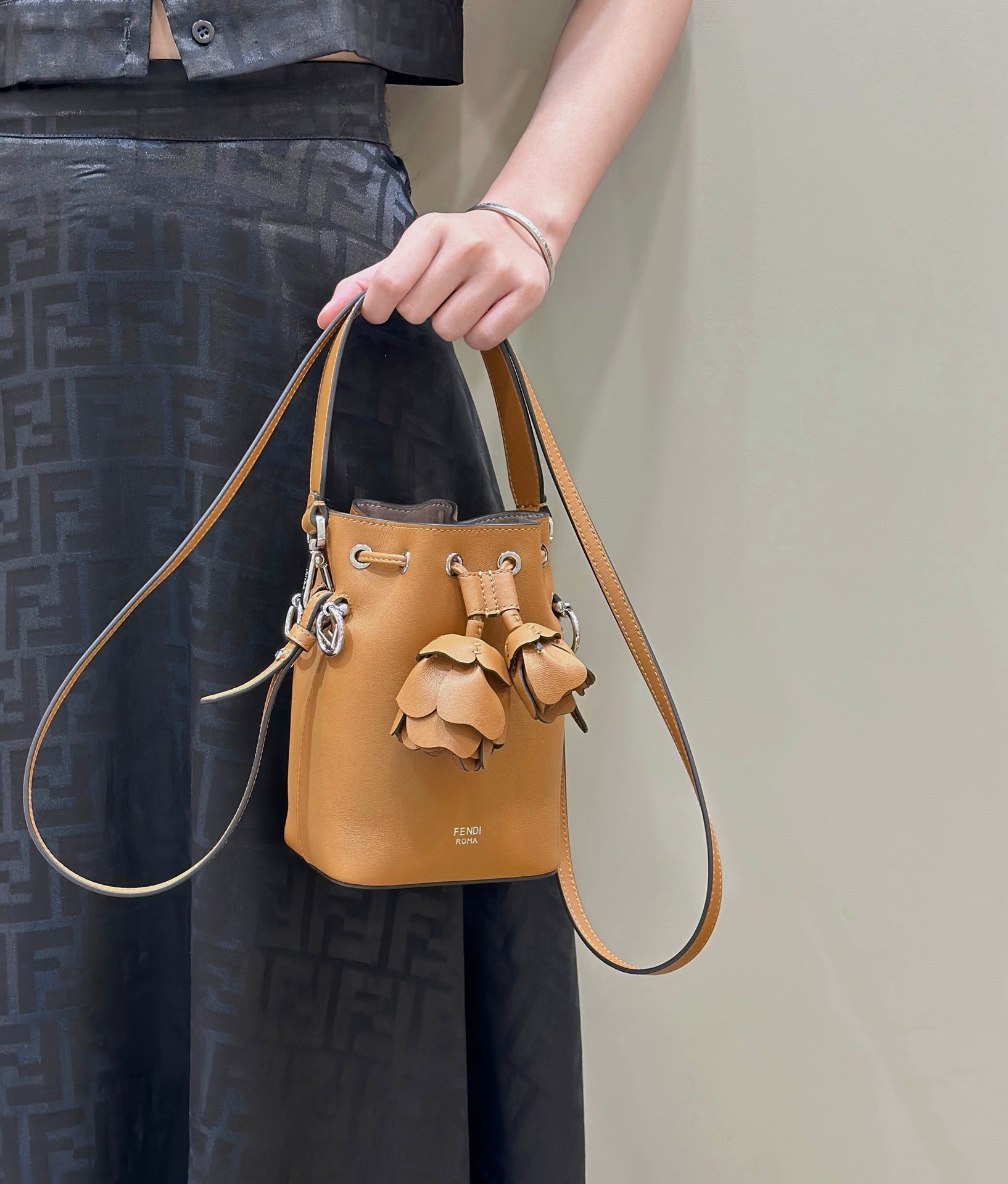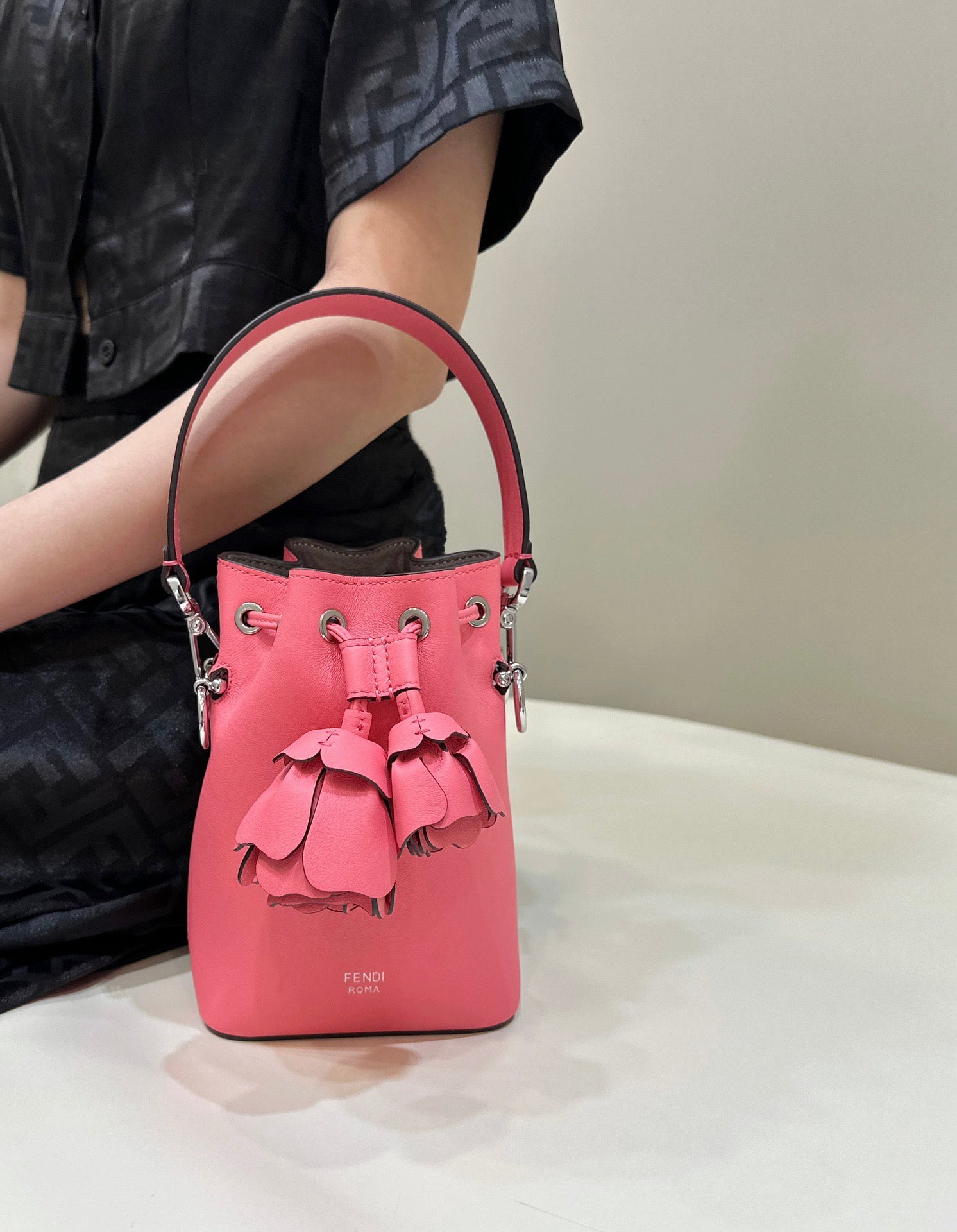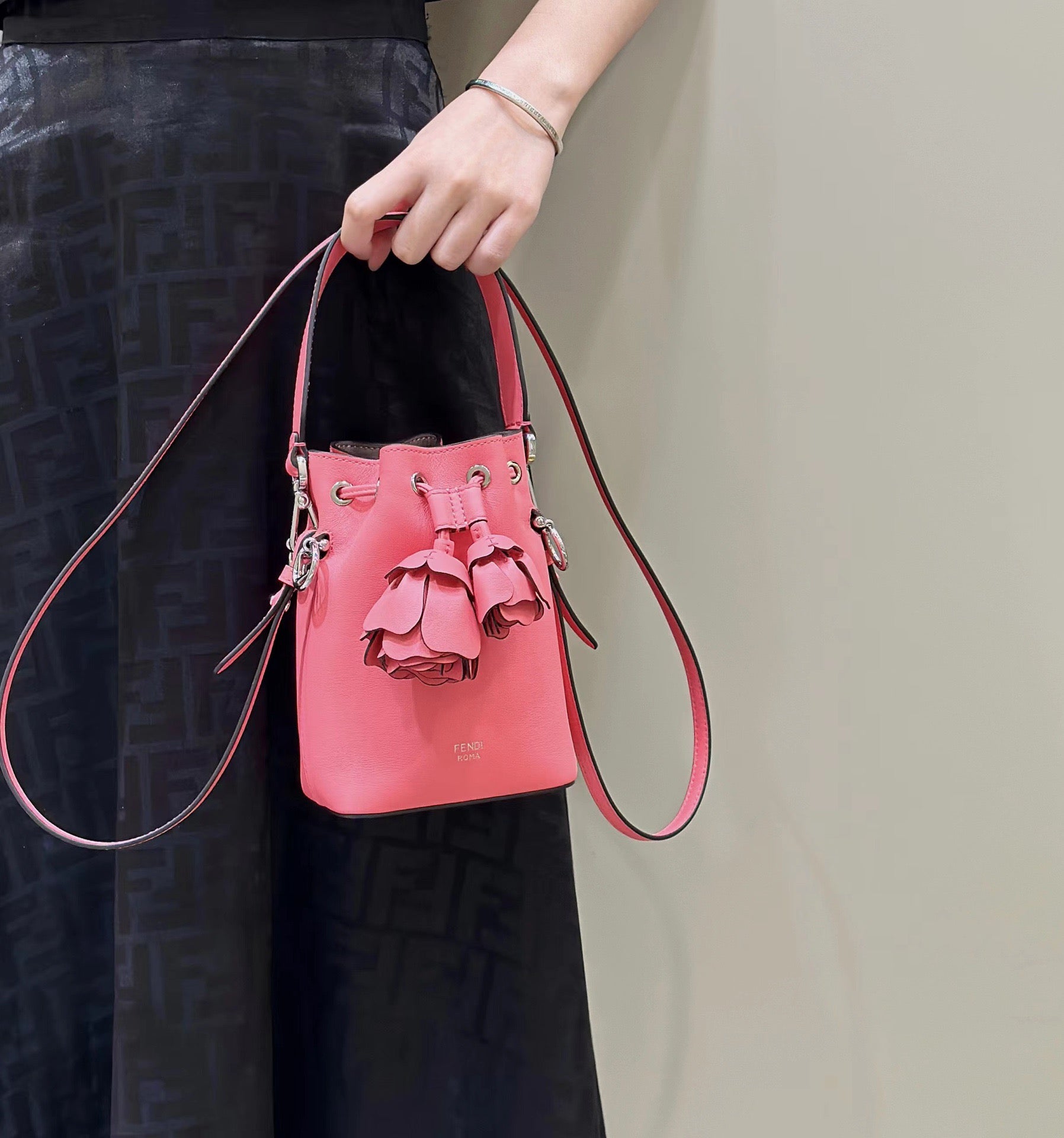 디테일: 3D 장미 장식, 드로스트링 클로저, 펜디 로고 하드웨어