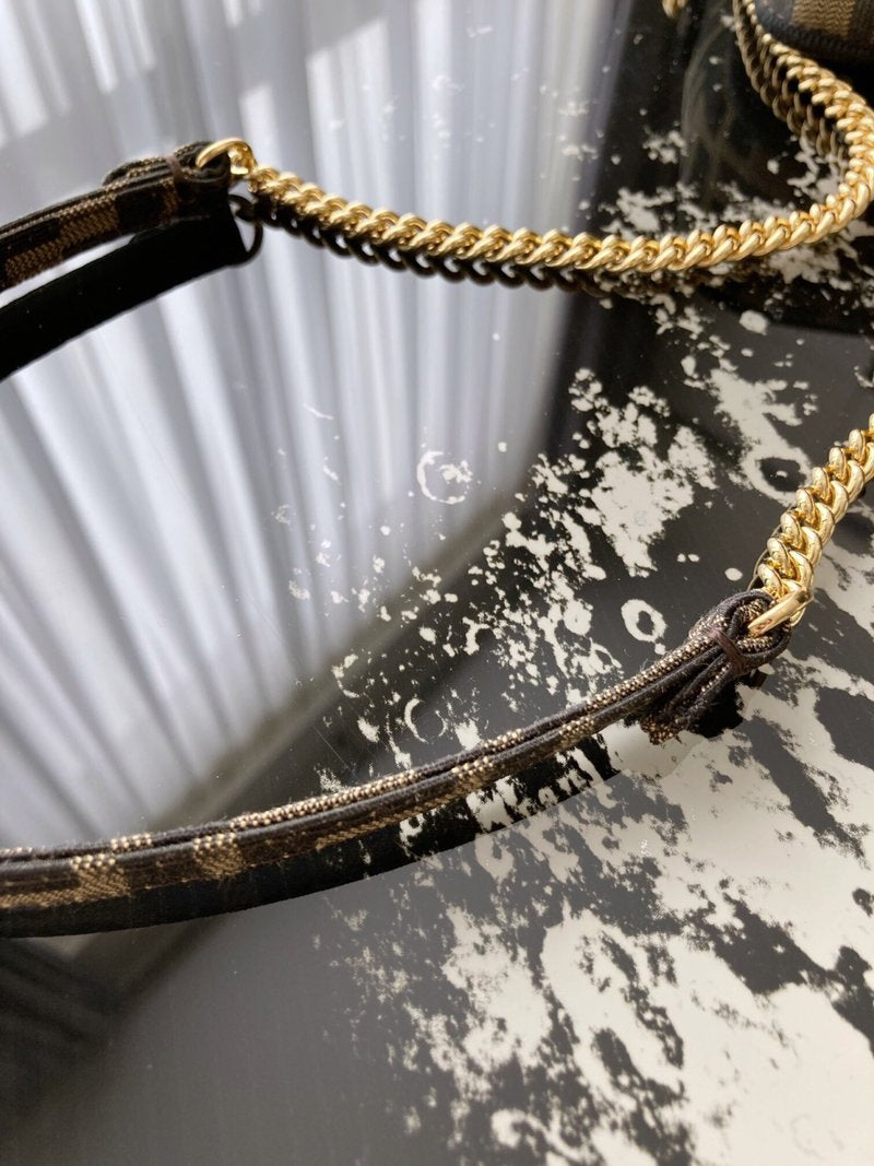 특유의 직사각형 플랩 형태와 전면의 FF 로고 버클이 클래식한 아름다움을 강조하며, 부드러운 곡선과 간결한 구조가 조화를 이룹니다. 펜디의 유산을 현대적으로 재해석한 디자인으로 미니백 트렌드를 이끌고 있습니다.