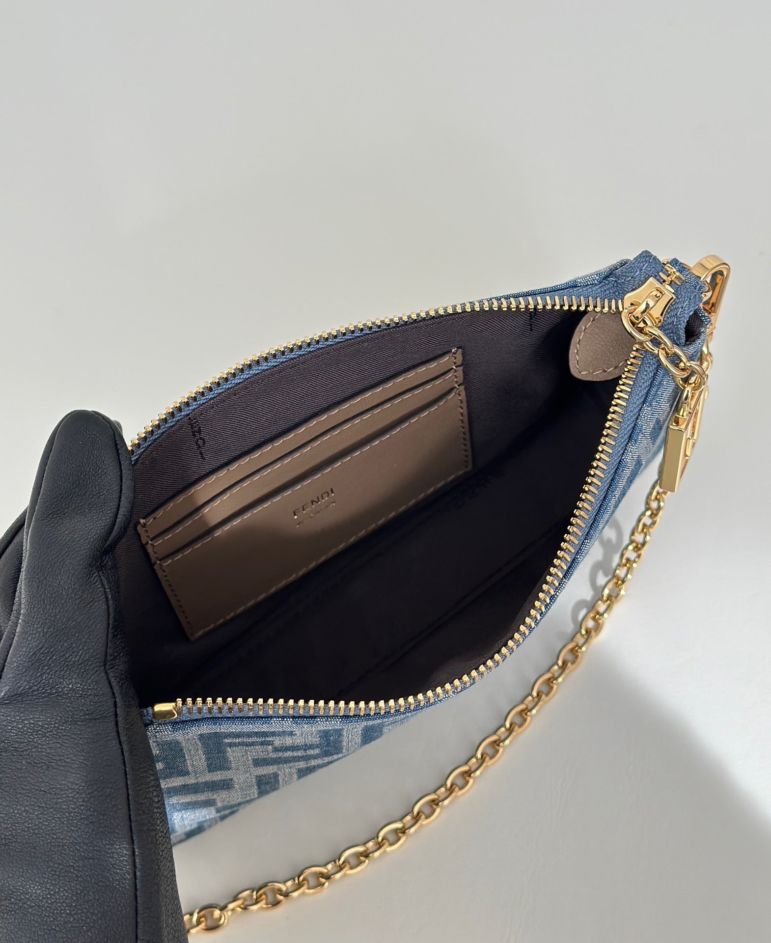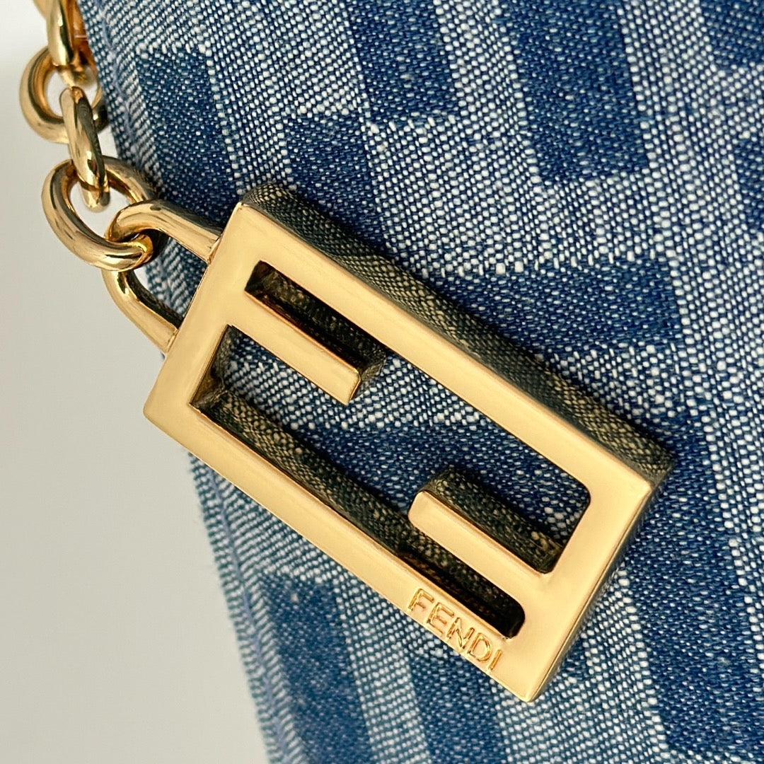 이 제품은 펜디의 상징적인 FF 로고가 자카드 직조로 표현되어 브랜드의 전통을 강조합니다. 전면에는 바게트 백 특유의 플랩과 FF 로고 메탈 버클이 고급스럽게 배치되어 있으며, 탈부착 가능한 체인 스트랩이 포함되어 클러치 또는 숄더백으로 다양한 연출이 가능합니다. 작지만 정교한 구조는 스타일리시한 감성과 실용성을 동시에 만족시킵니다.