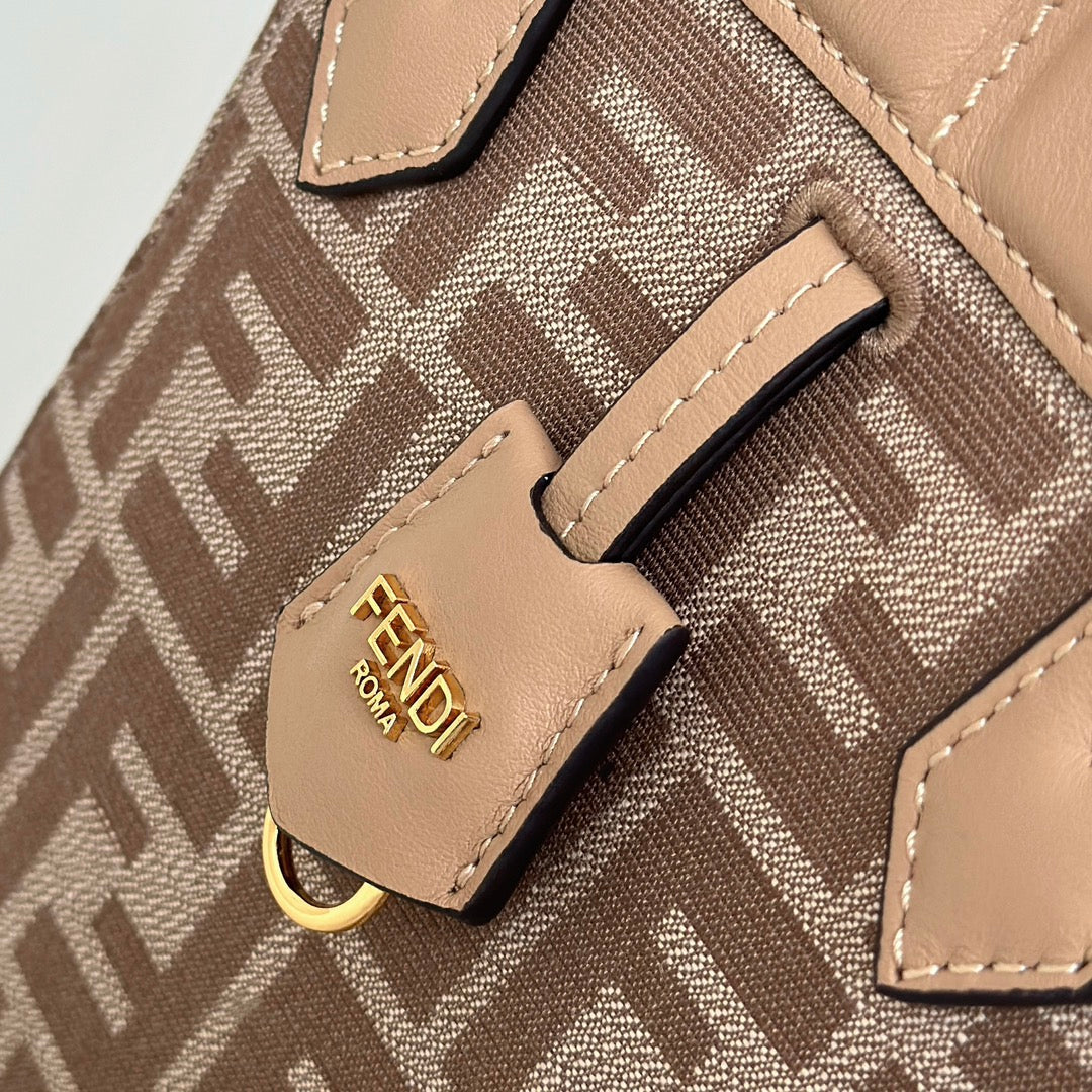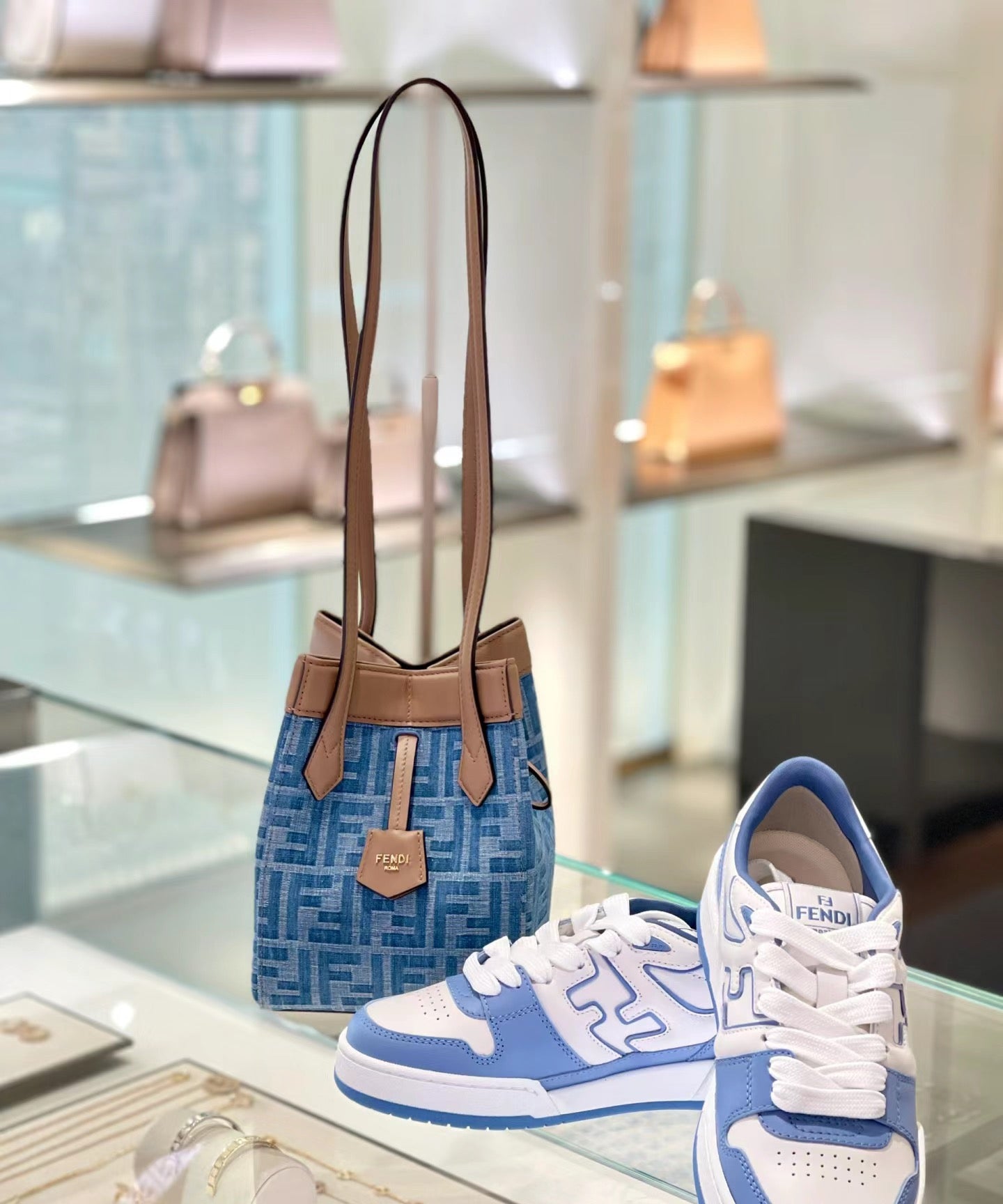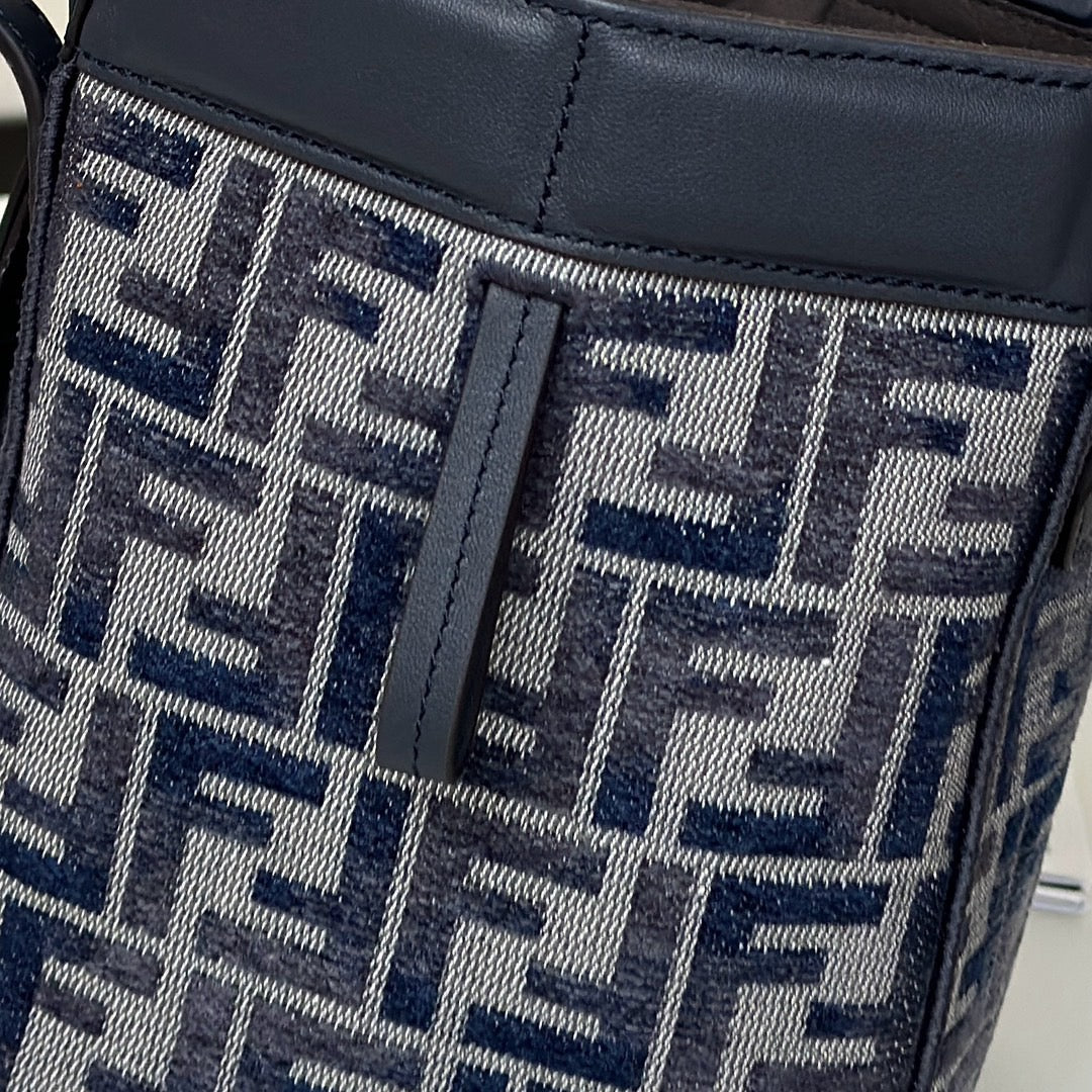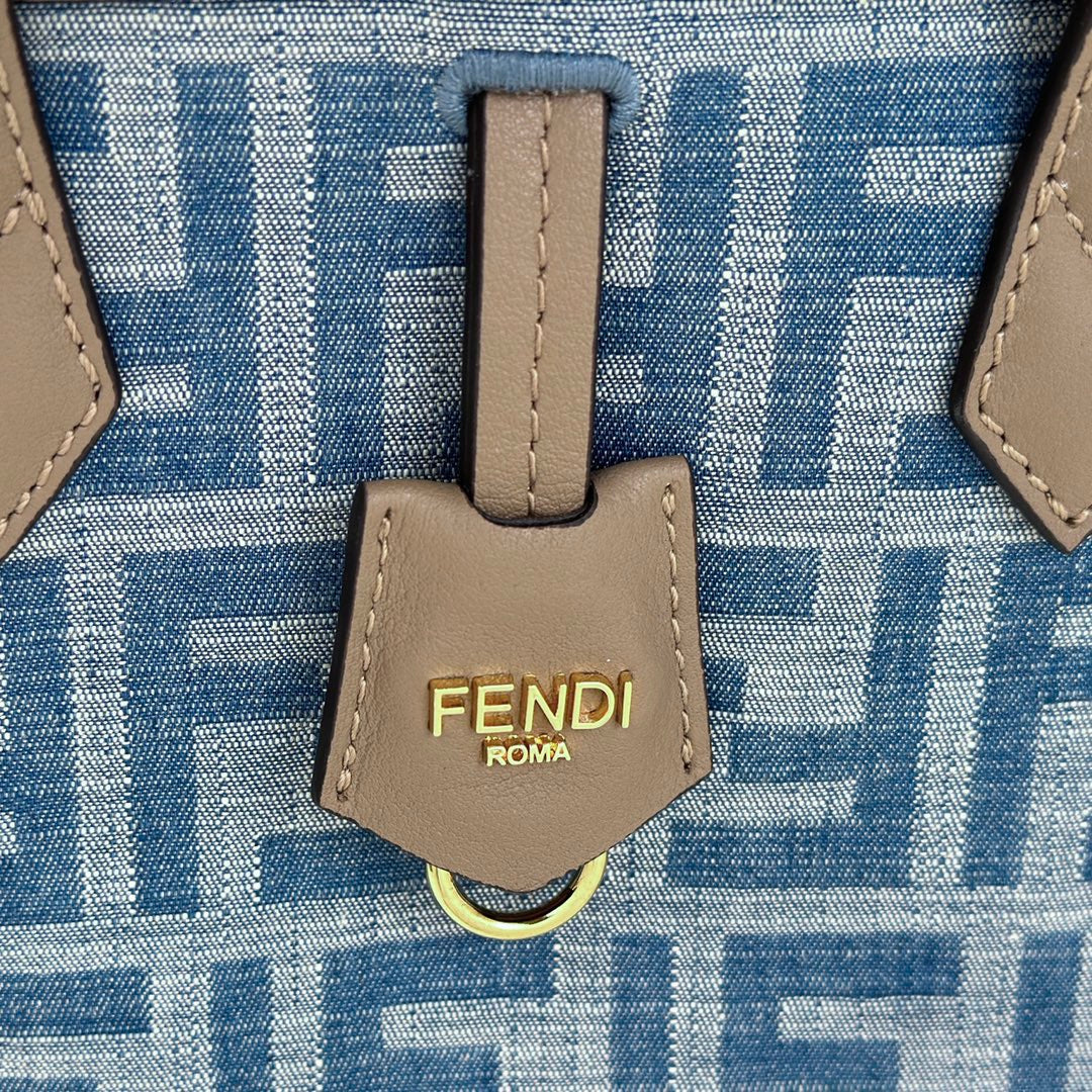 FF 자카드 패브릭은 견고하면서도 가벼운 것이 특징이며, 소가죽 트리밍이 전체적인 고급감을 더합니다. 내부는 스웨이드 또는 마이크로파이버 소재로 마감되며, 자석 클로저와 펜디 로고 각인이 있는 하드웨어가 세련된 느낌을 줍니다.