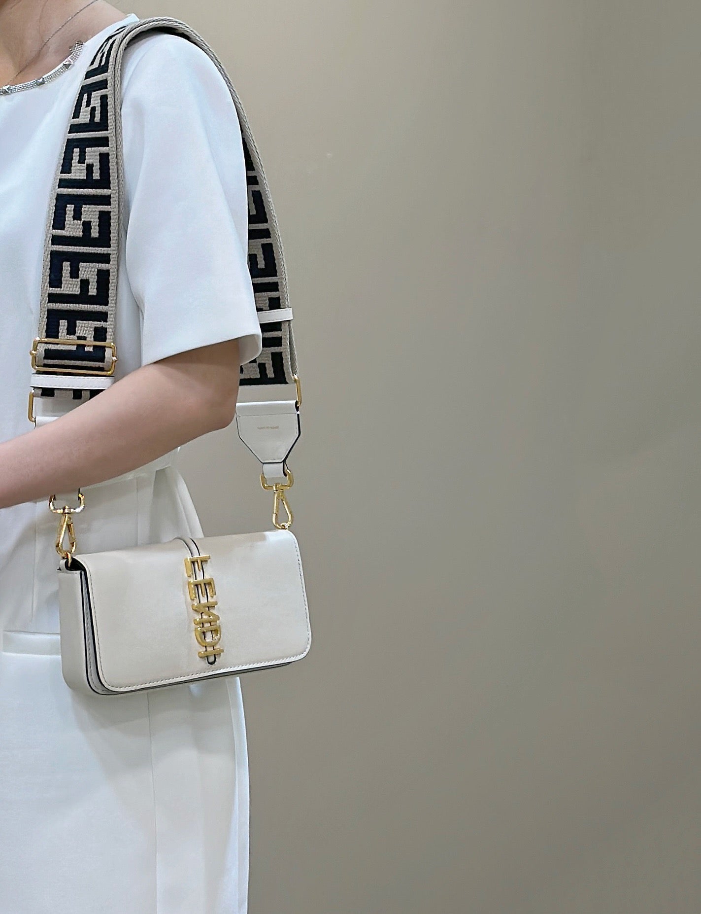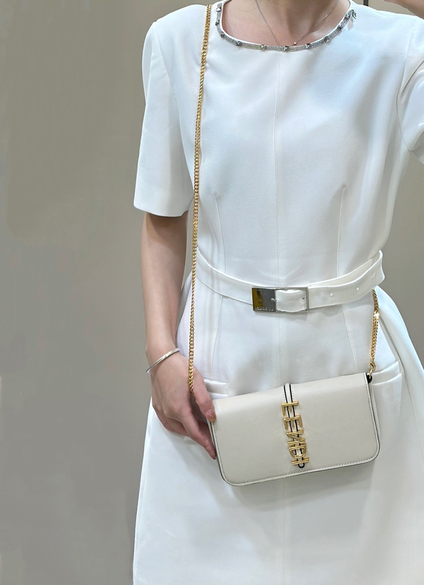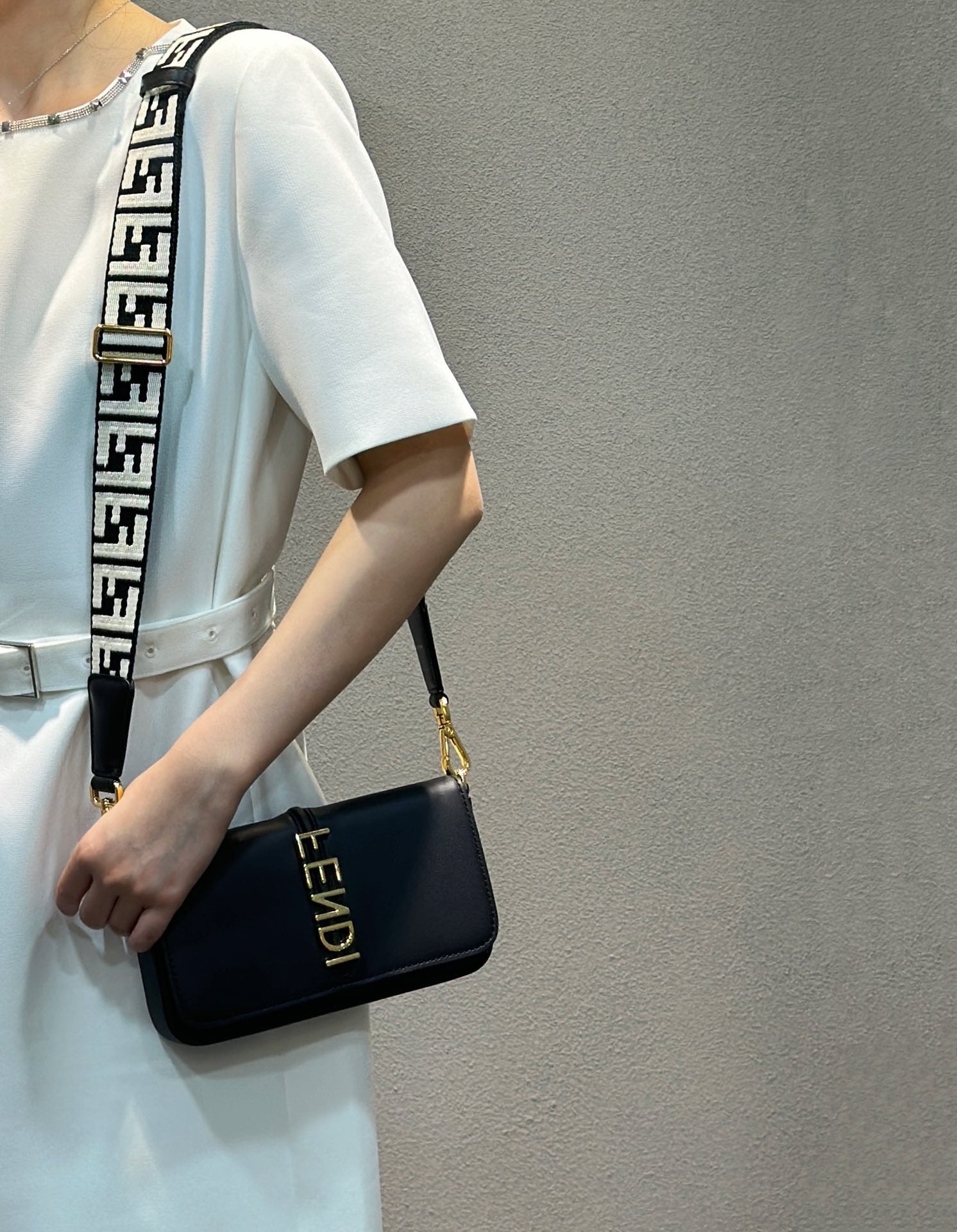 모던한 미니멀 룩부터 클래식한 이브닝 룩까지 다양한 스타일에 잘 어울리는 아이템입니다. 특히 모노톤 의상에 포인트로 매치하면 세련된 분위기를 연출할 수 있으며, 펜디 로고 디테일이 룩에 럭셔리한 감성을 더해줍니다.