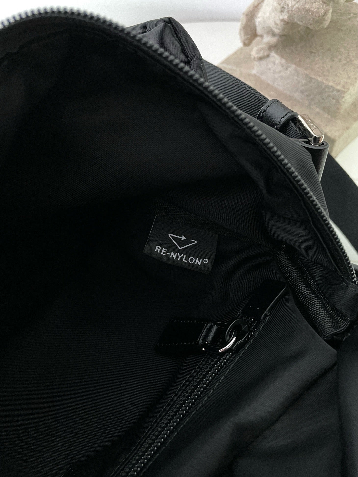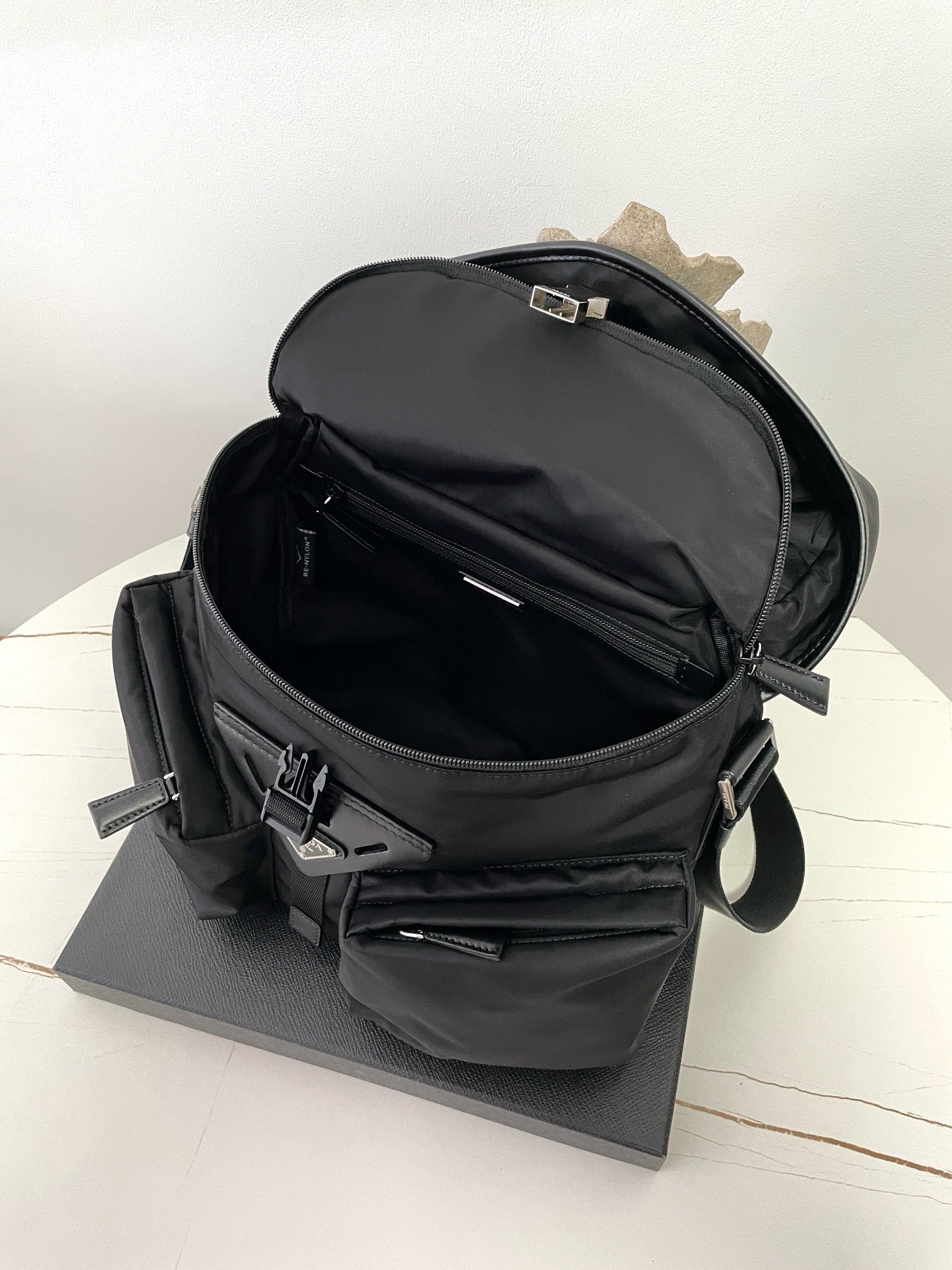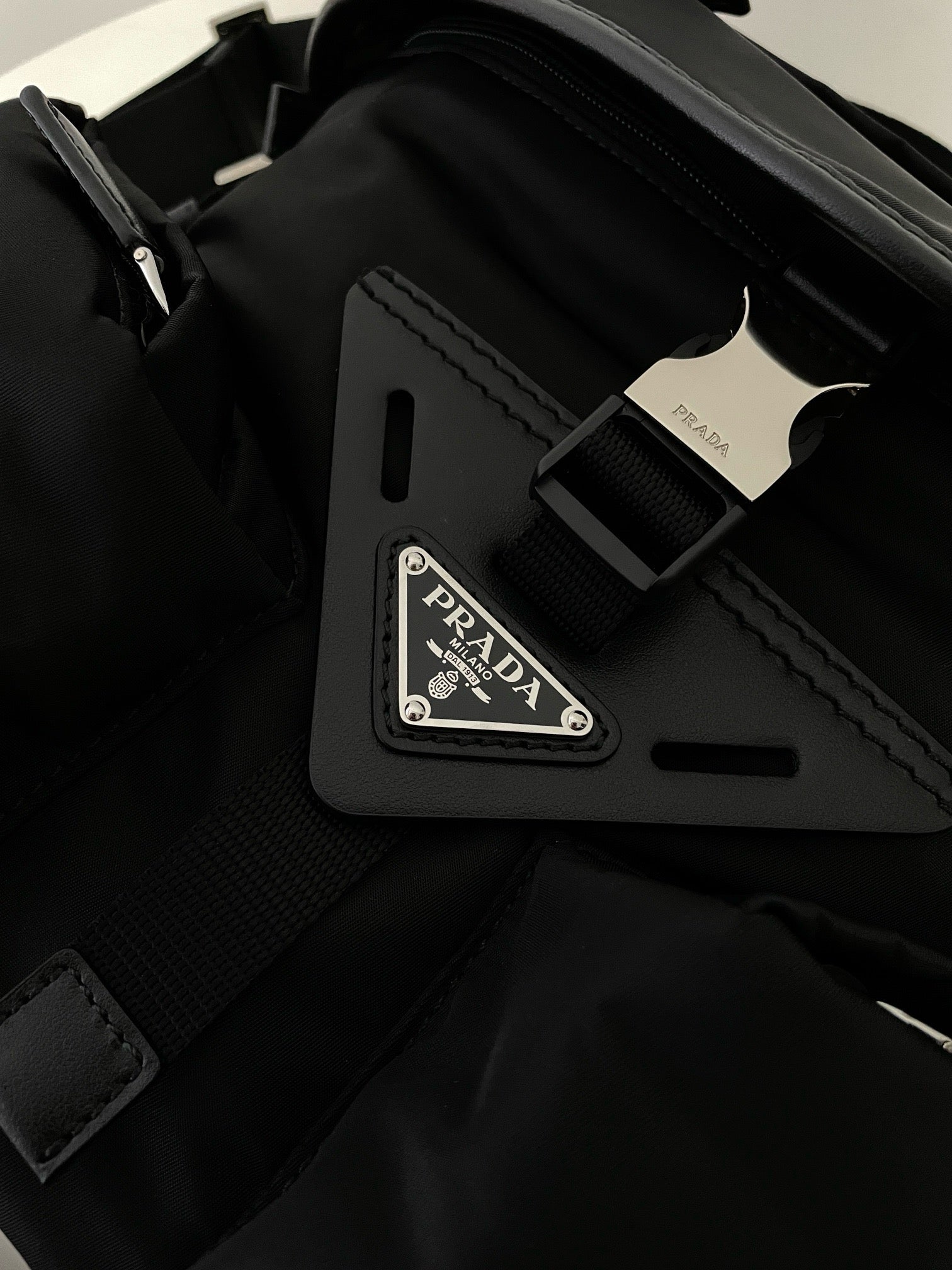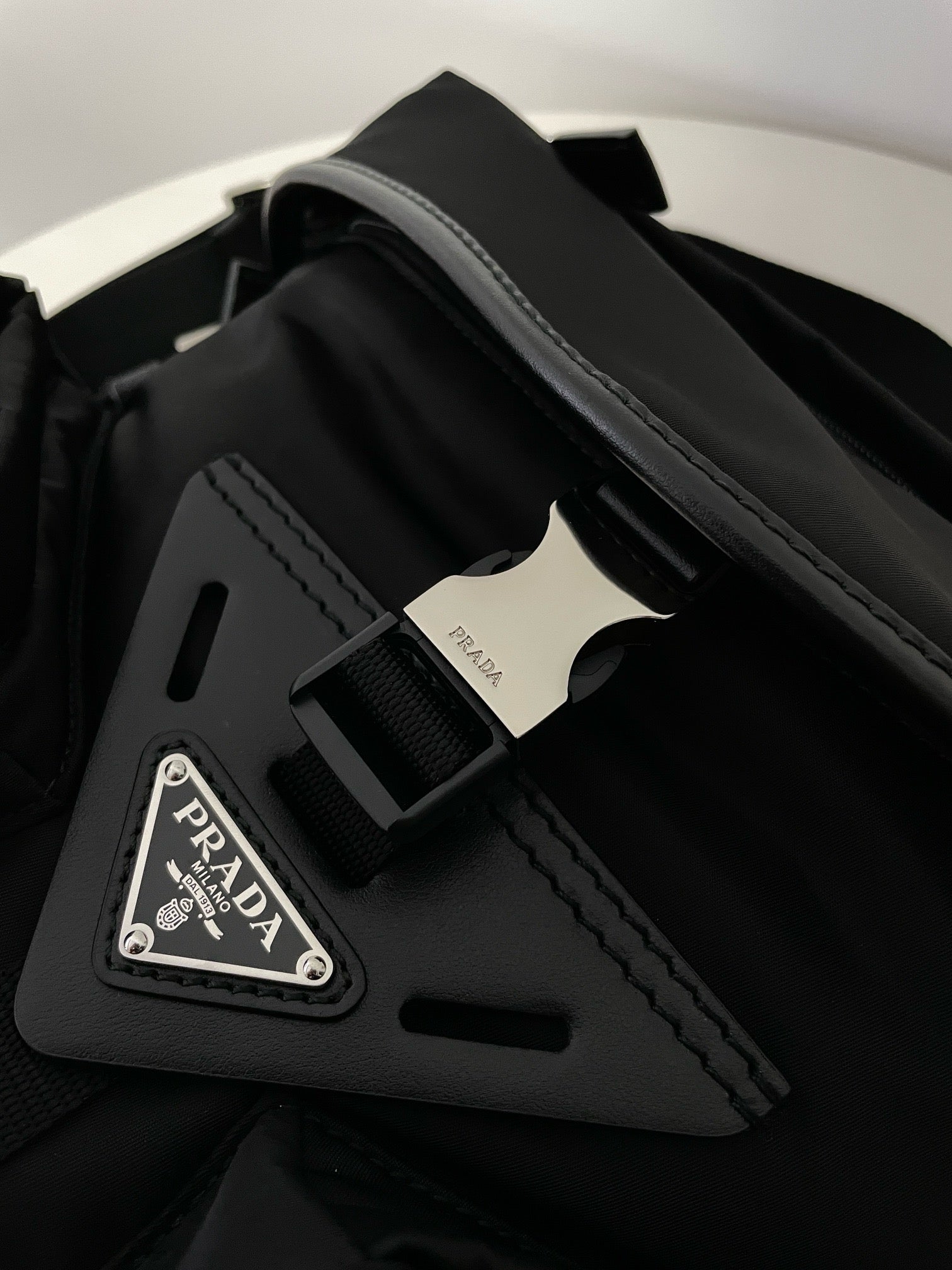 전면에 입체적으로 강조된 프라다 삼각 로고 패치가 시선을 끌며, 브랜드의 정체성을 강하게 드러냅니다. 리사이클 나일론 소재는 가볍고 방수 기능이 있어 실용적이며, 간결한 실루엣으로 다양한 착장에 자연스럽게 어울립니다.