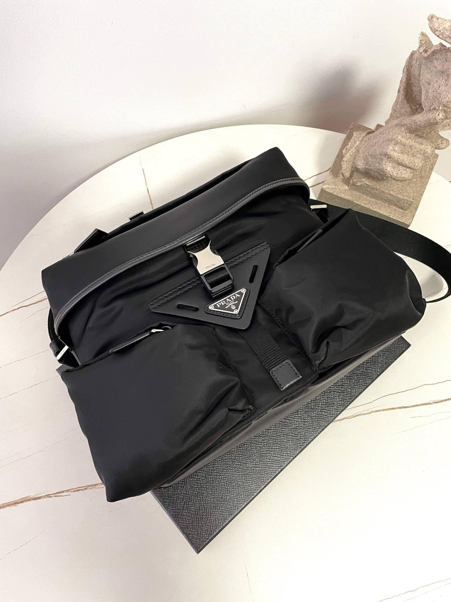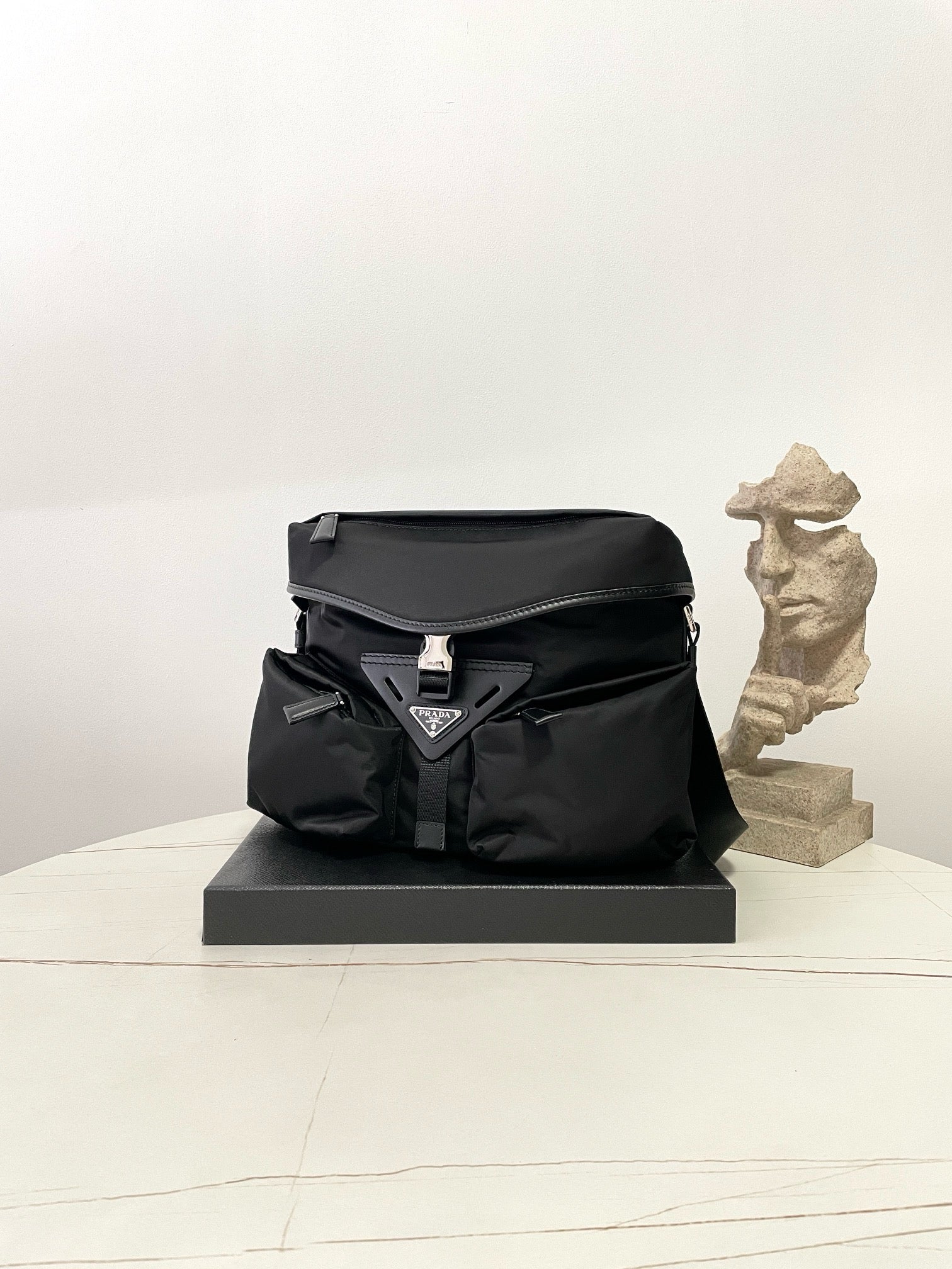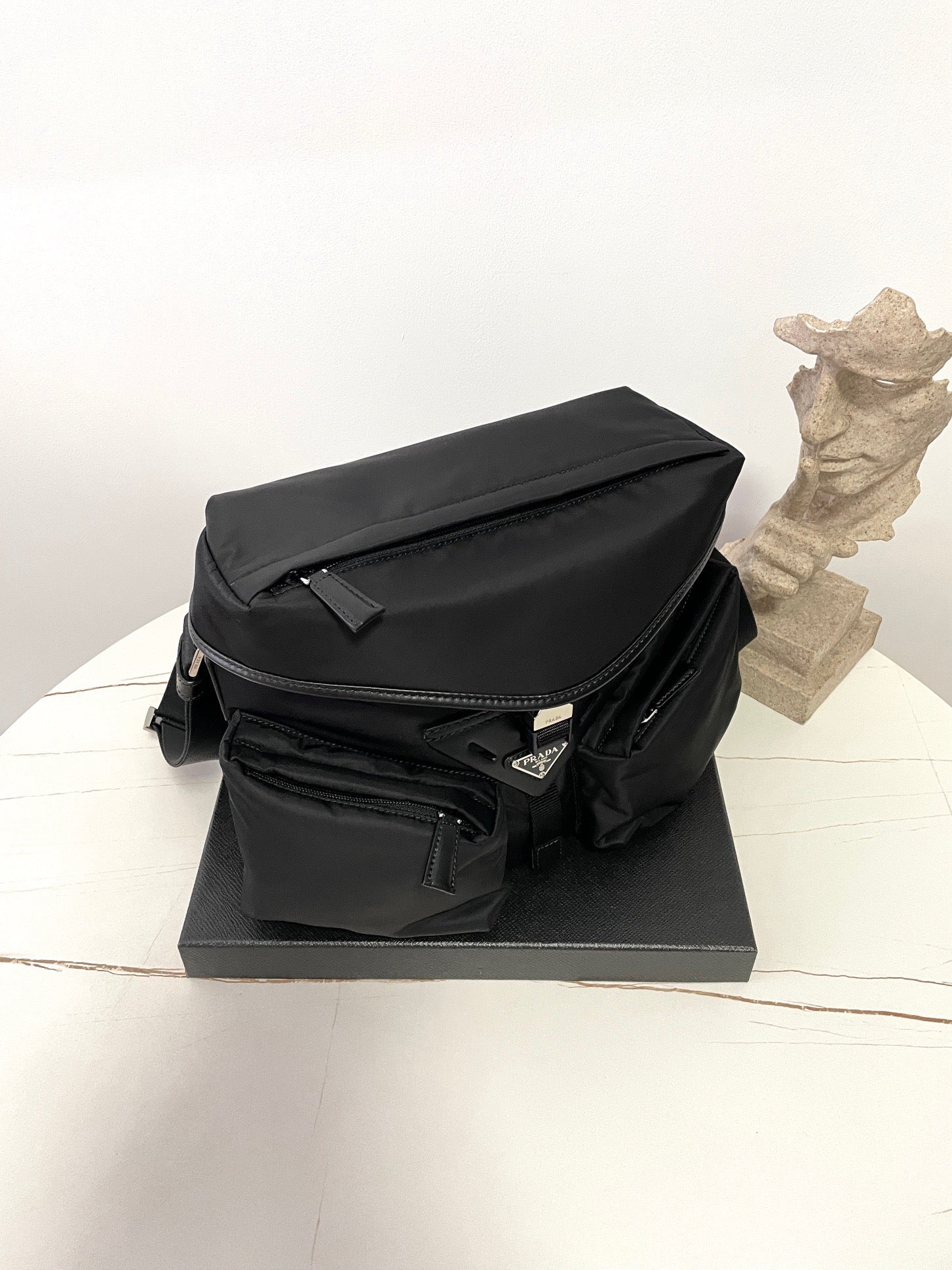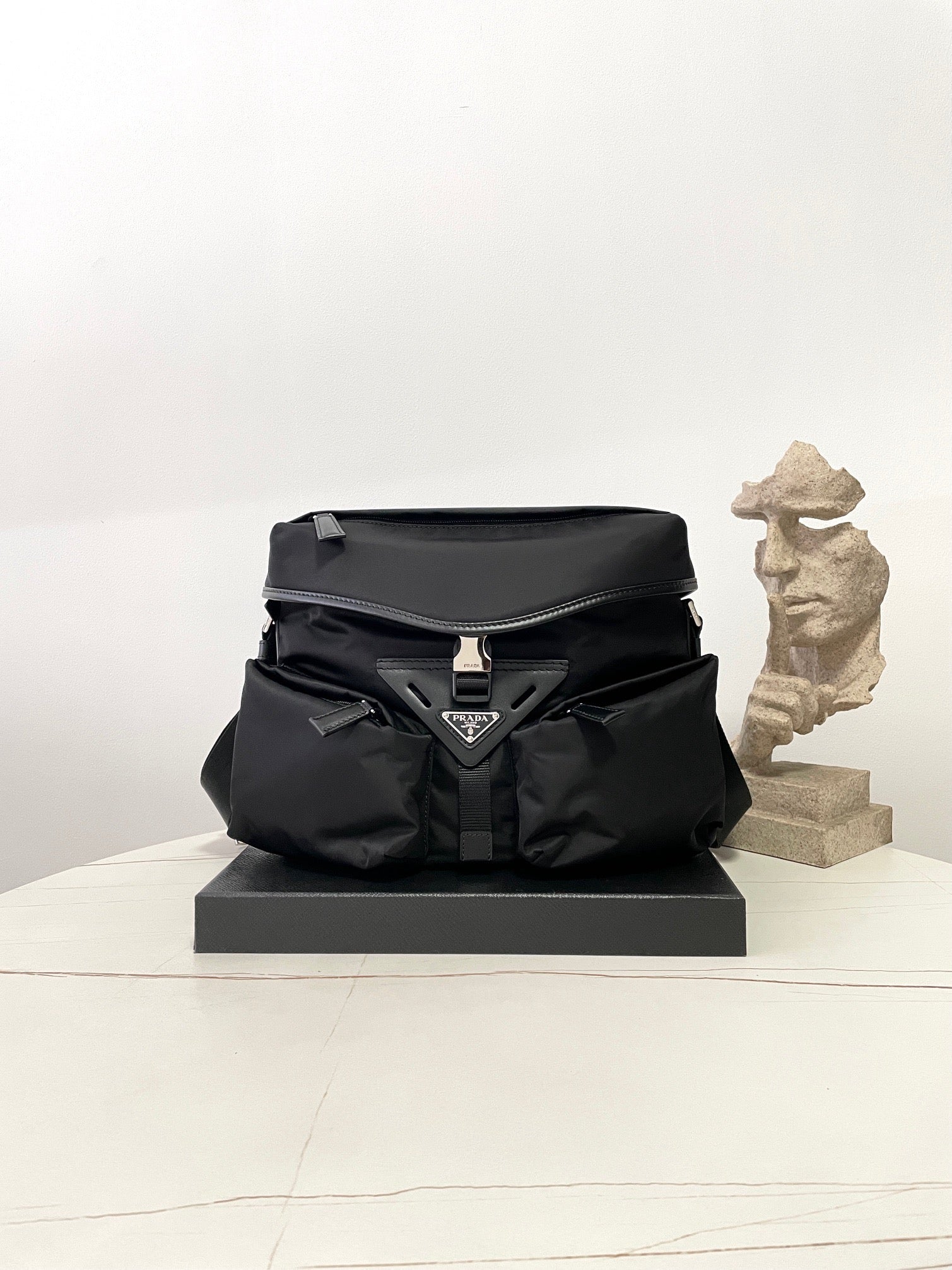 전면에 입체적으로 강조된 프라다 삼각 로고 패치가 시선을 끌며, 브랜드의 정체성을 강하게 드러냅니다. 리사이클 나일론 소재는 가볍고 방수 기능이 있어 실용적이며, 간결한 실루엣으로 다양한 착장에 자연스럽게 어울립니다.