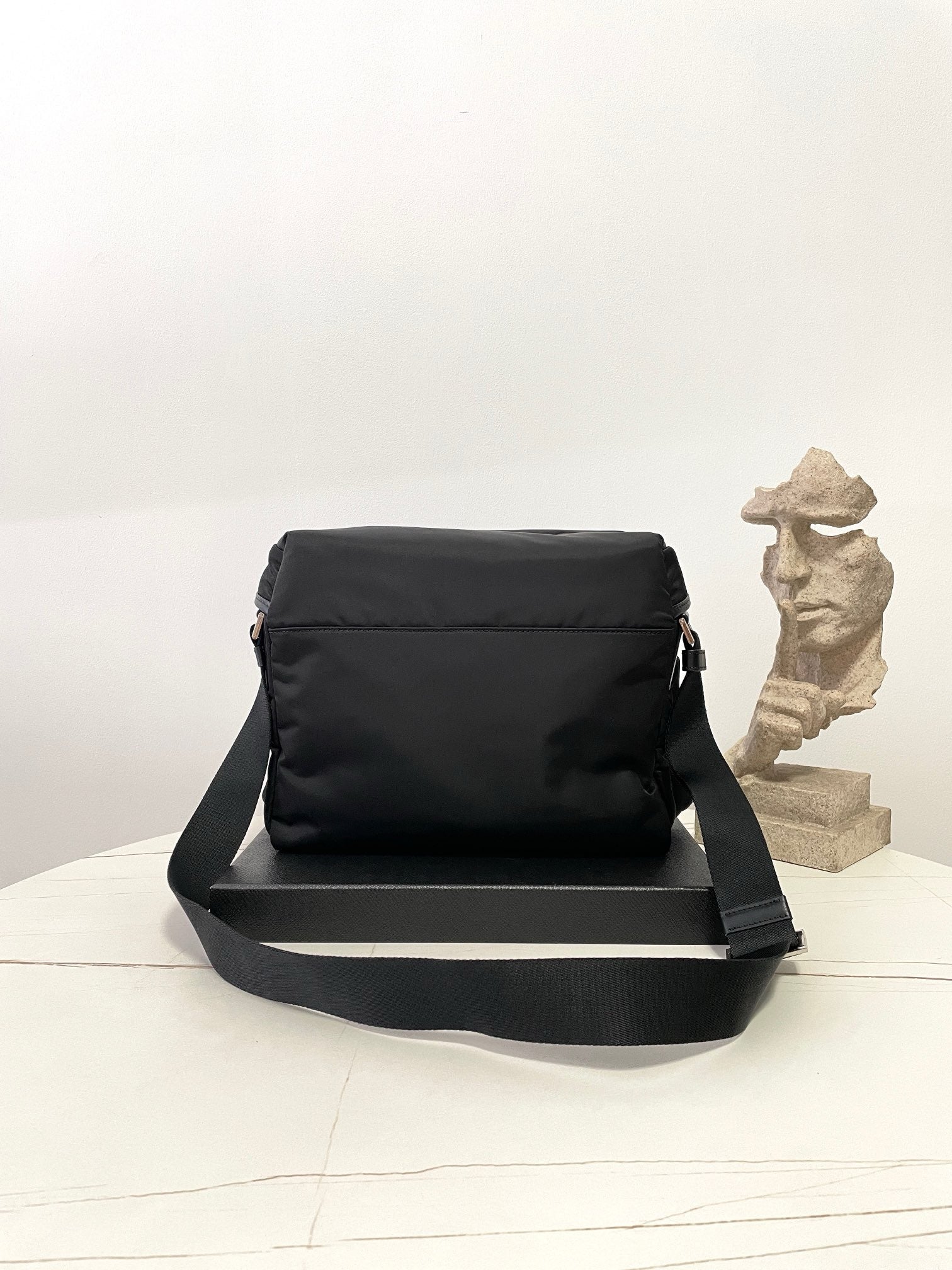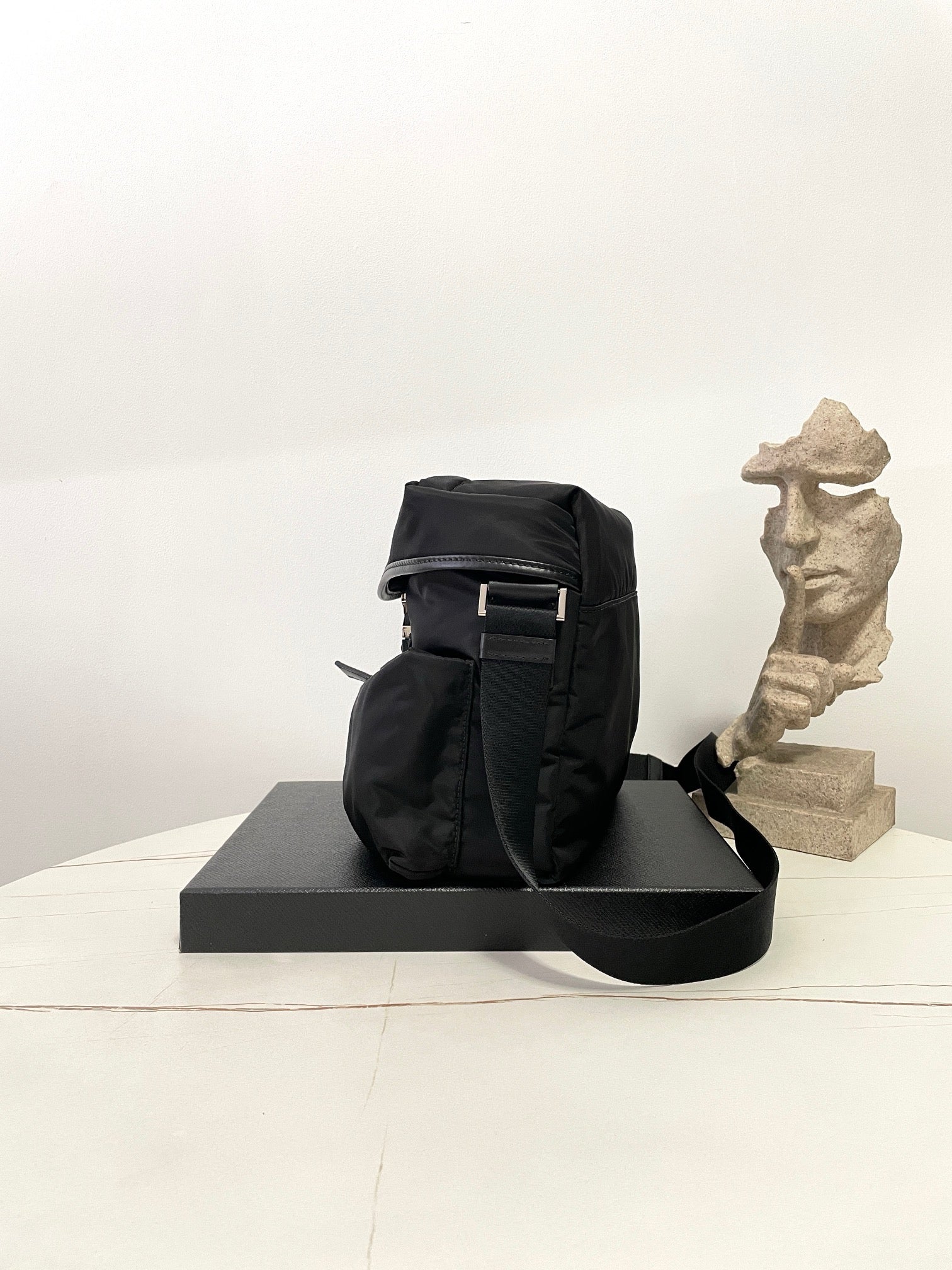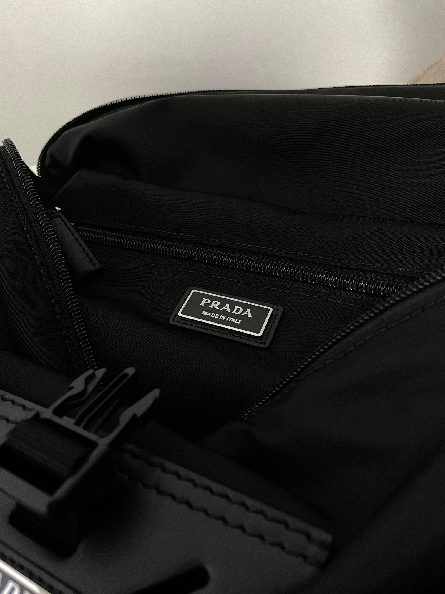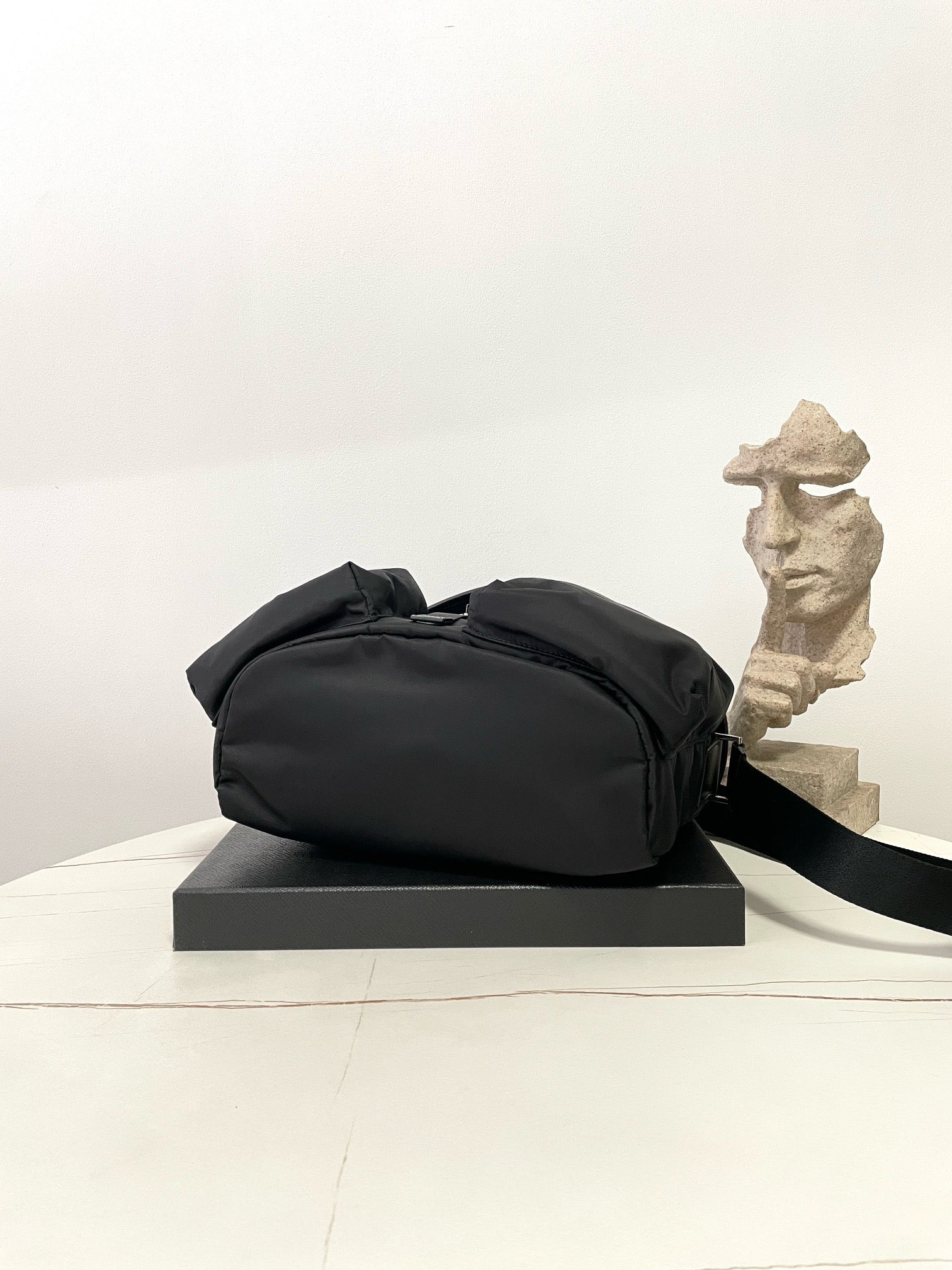 전면에 입체적으로 강조된 프라다 삼각 로고 패치가 시선을 끌며, 브랜드의 정체성을 강하게 드러냅니다. 리사이클 나일론 소재는 가볍고 방수 기능이 있어 실용적이며, 간결한 실루엣으로 다양한 착장에 자연스럽게 어울립니다.