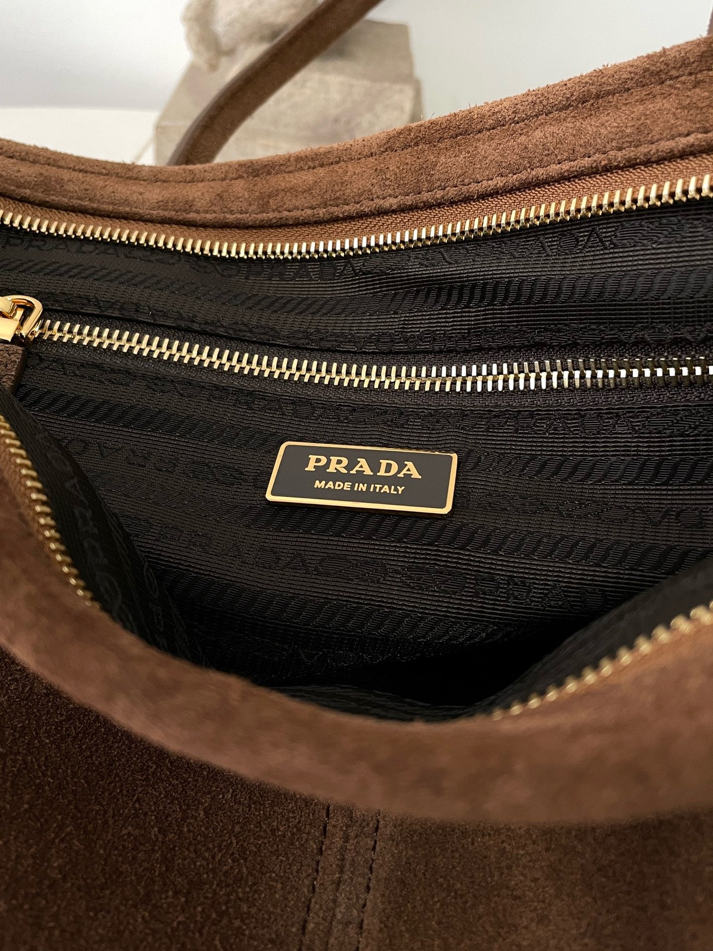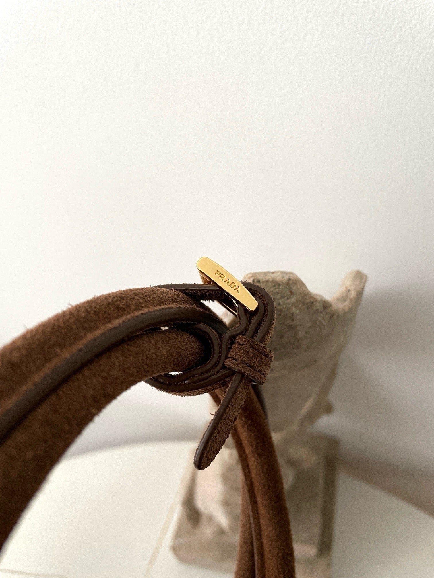 스웨이드 특유의 따뜻하고 부드러운 촉감이 돋보이며, 프라다의 정교한 재단 기술이 더해져 우아한 곡선과 구조적 안정감을 동시에 갖추고 있습니다. 하드웨어는 골드 또는 앤틱 브론즈 컬러로 마감되어 빈티지한 고급스러움을 더하며, 프론트에는 절제된 메탈 로고가 프라다만의 품격을 표현합니다.