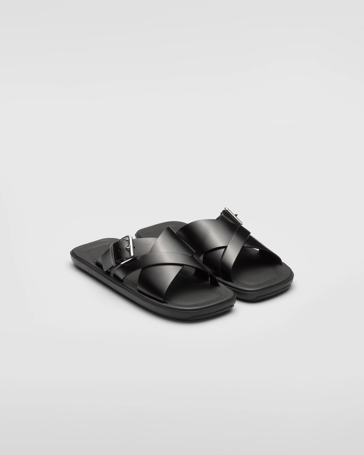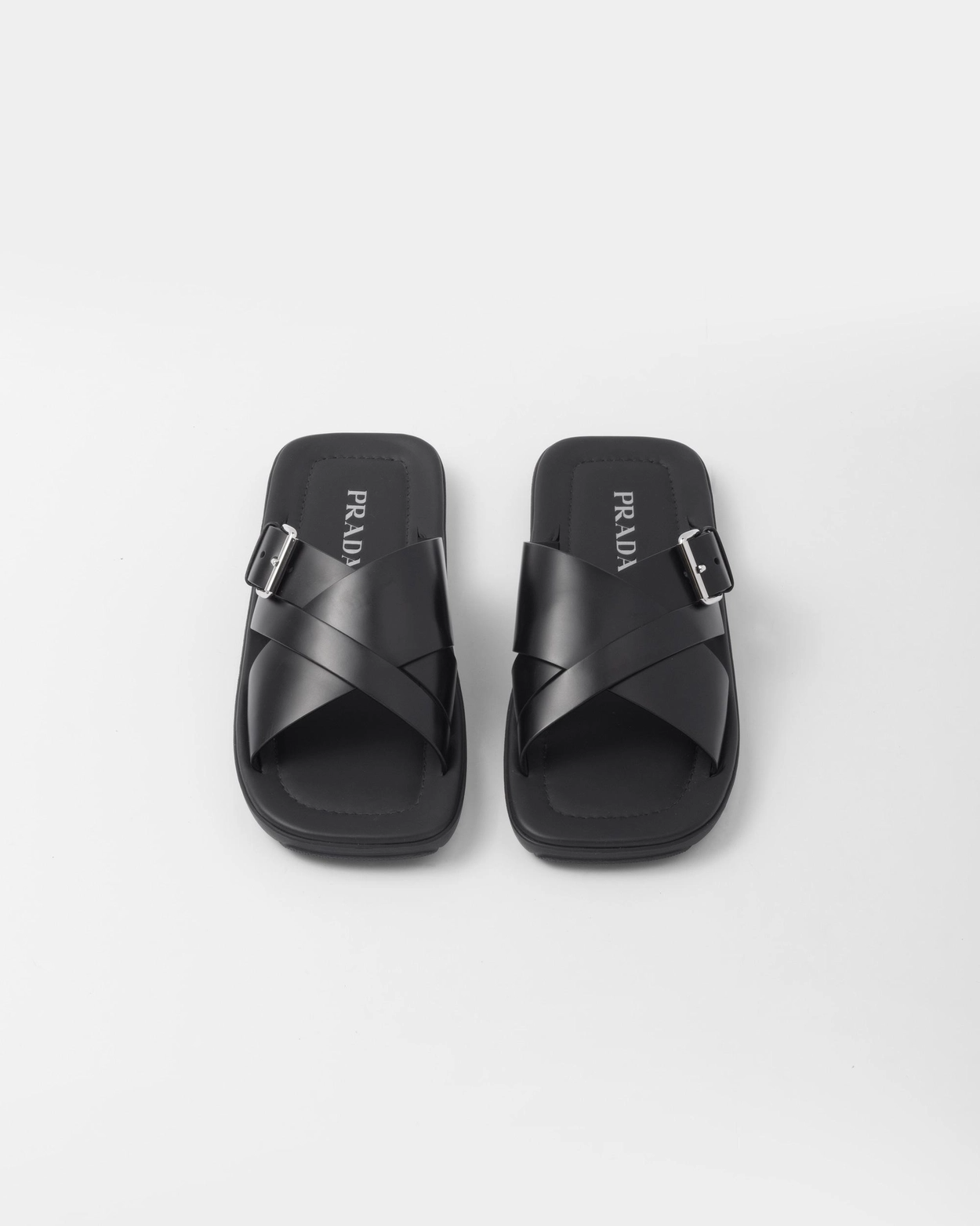 광택 있는 브러시드 가죽과 인체공학적 풋베드, 그리고 프라다의 절제된 디자인이 조화를 이룬 고급 슬라이드 슈즈입니다.