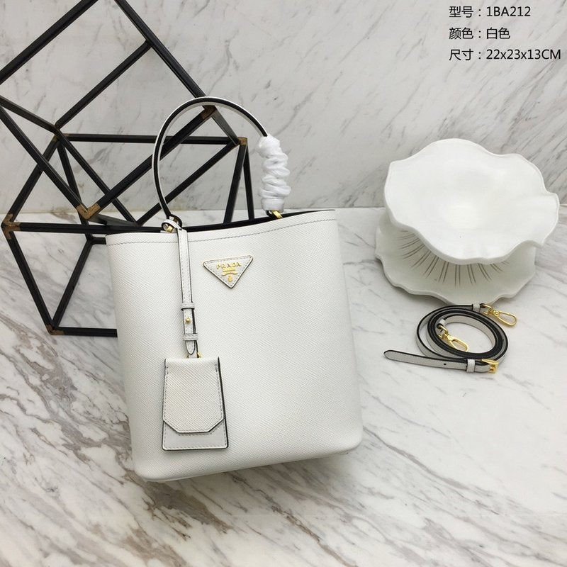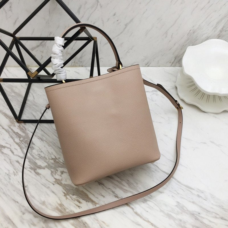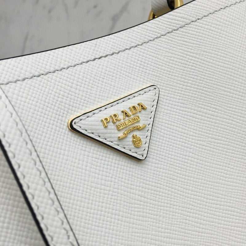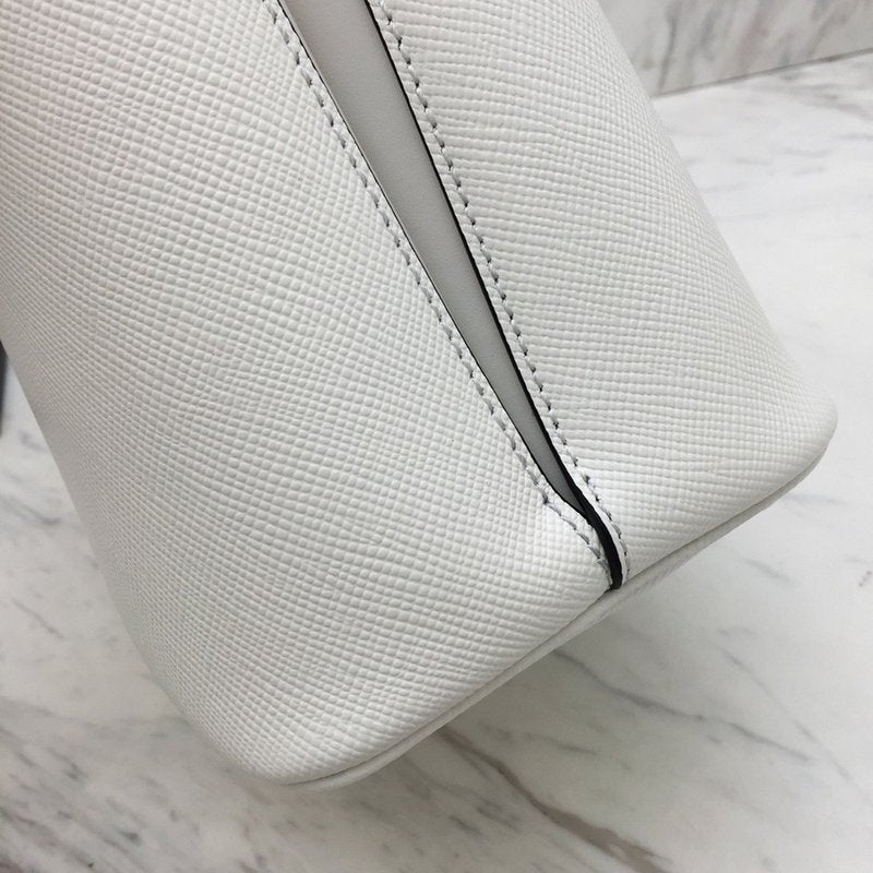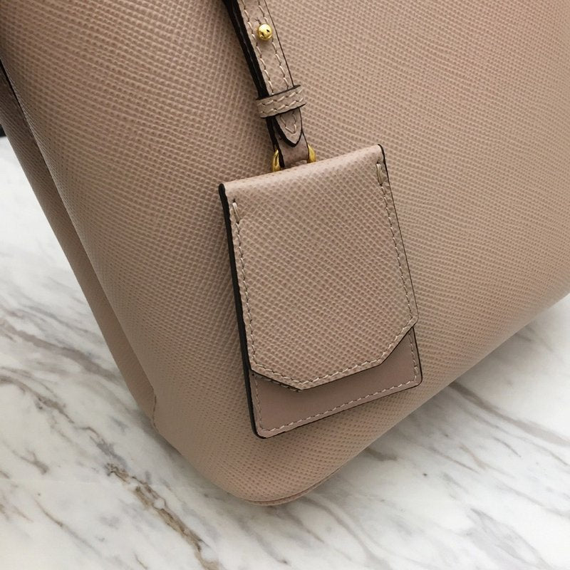 이 백은 직사각형 구조의 클래식한 토트백 형태로, 견고한 사피아노 레더가 사용되어 내구성이 뛰어나고 스크래치에 강합니다. 중앙의 골드 또는 실버 톤 프라다 로고 메탈 플레이트와 깔끔한 더블 핸들이 브랜드 특유의 우아한 감성을 전달합니다.