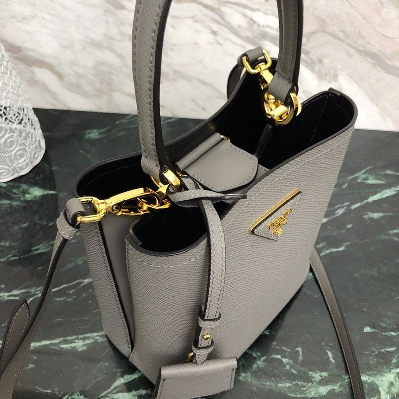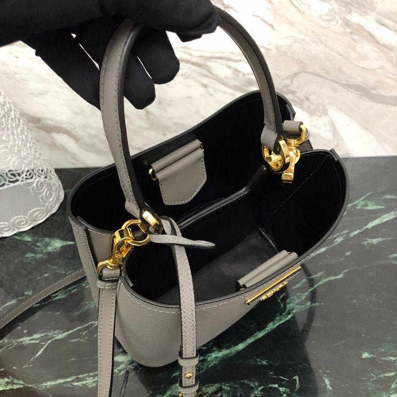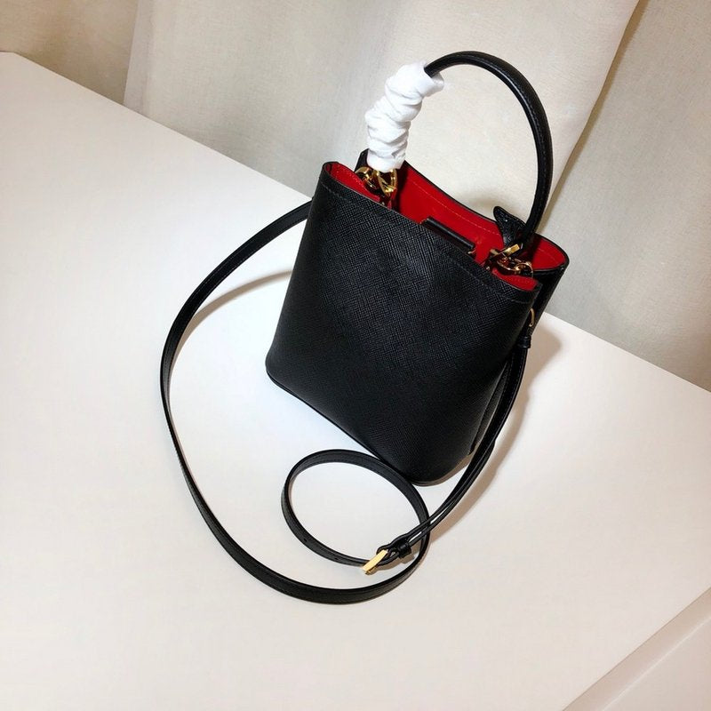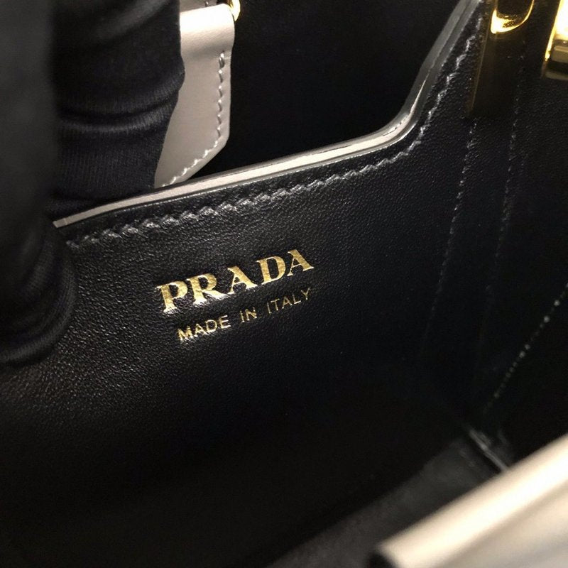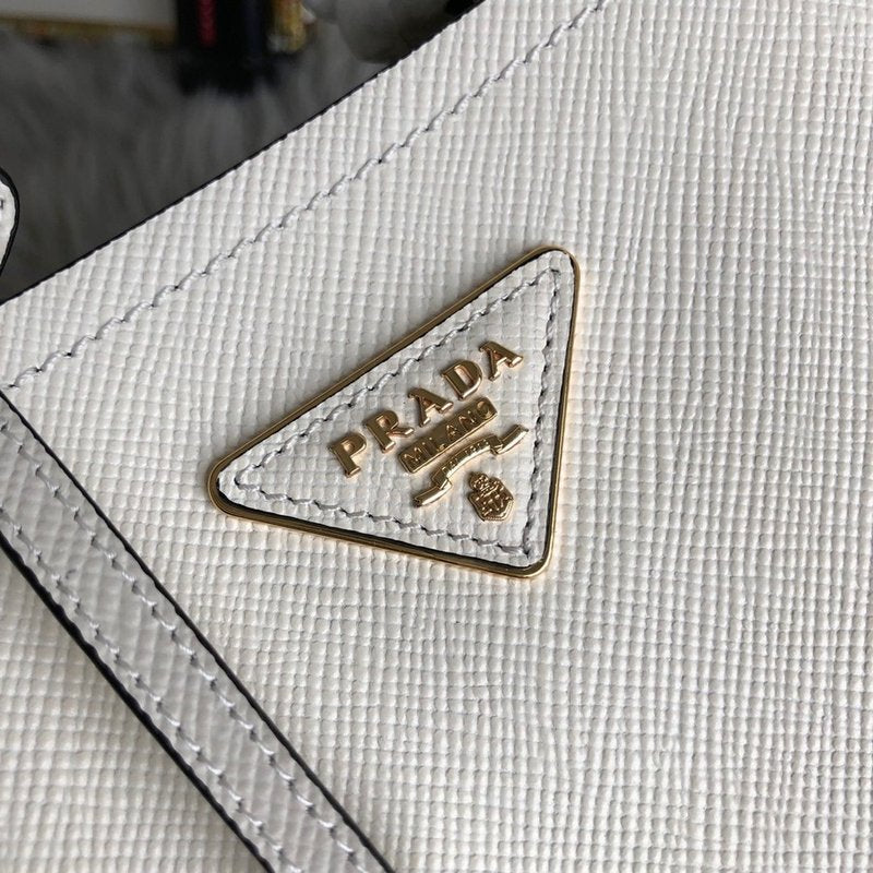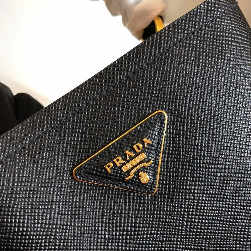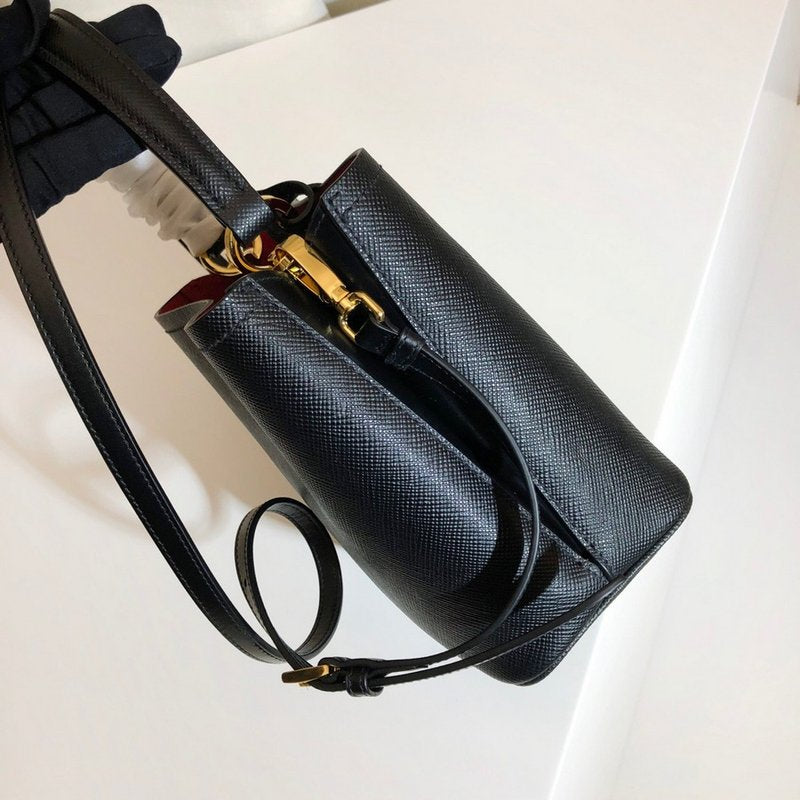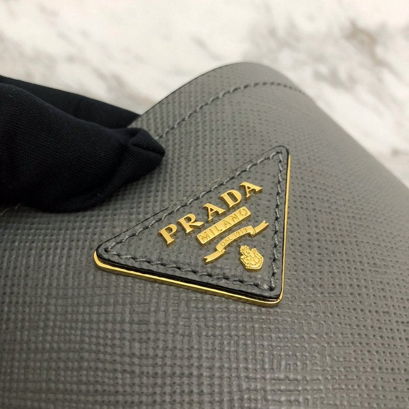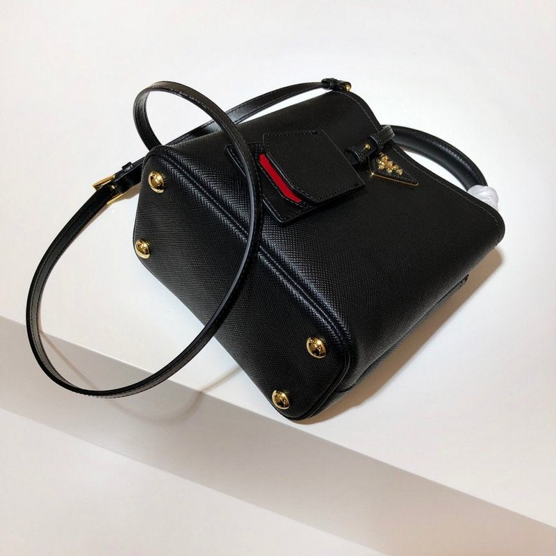 스몰 사이즈이지만 견고한 구조와 고급스러운 사피아노 레더 소재가 어우러져 정돈된 인상을 줍니다. 중앙에는 프라다의 메탈 로고 플레이트가 포인트로 배치되어 있으며, 더블 핸들과 함께 탈부착 가능한 숄더 스트랩이 구성되어 다양한 스타일링이 가능합니다.