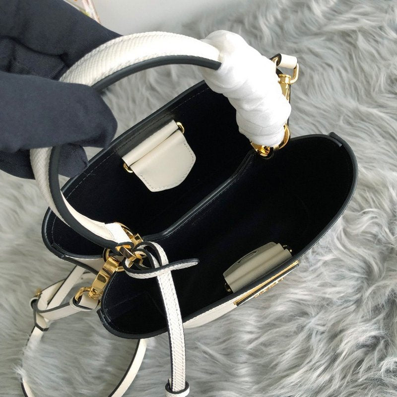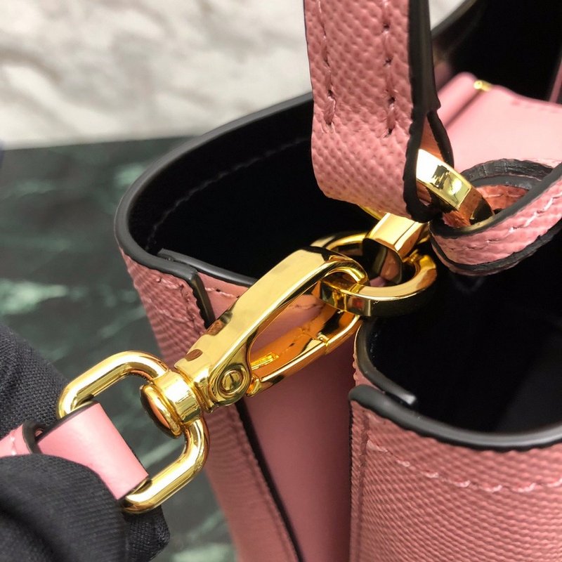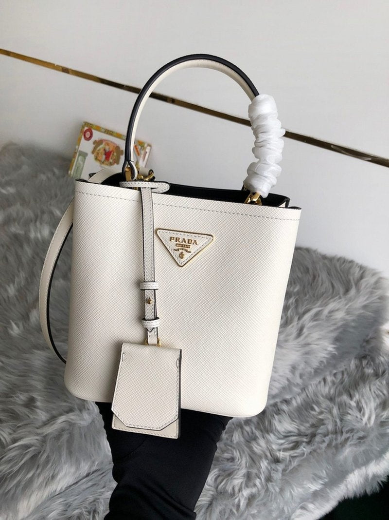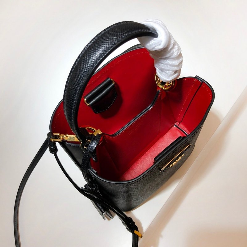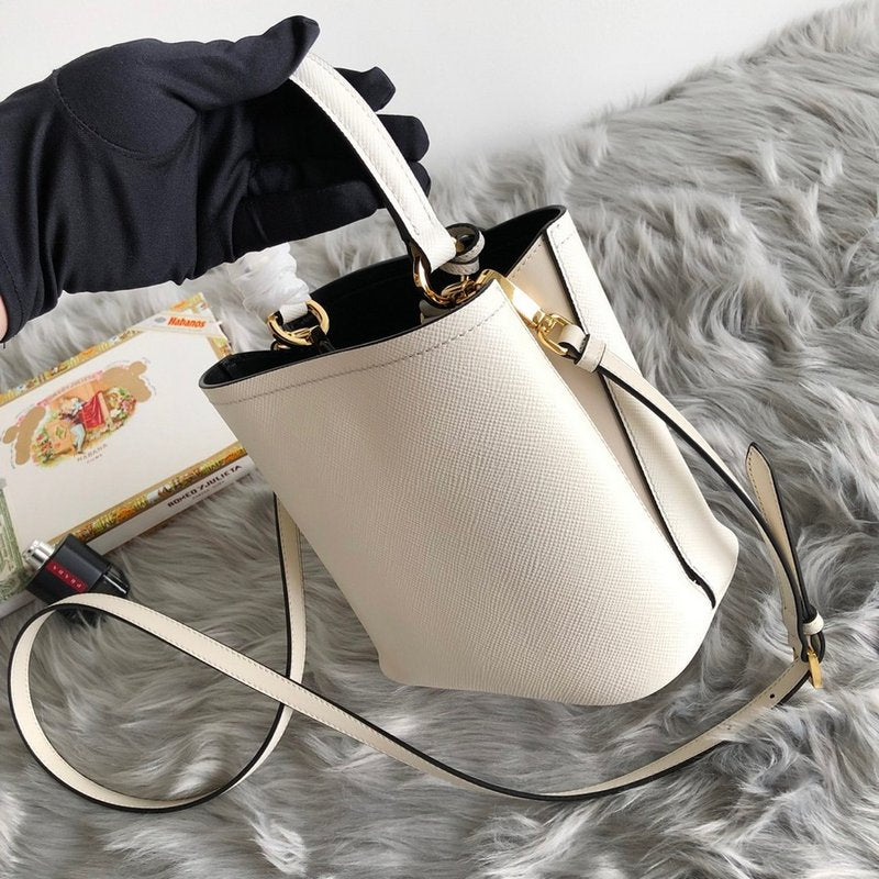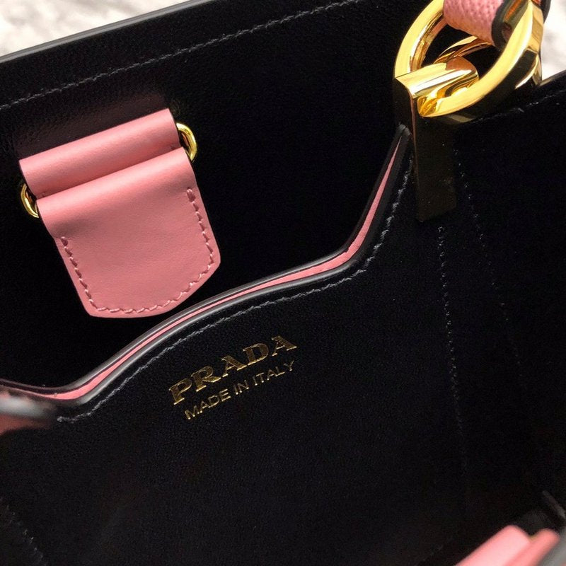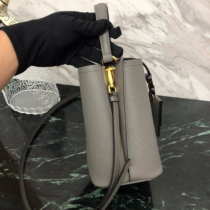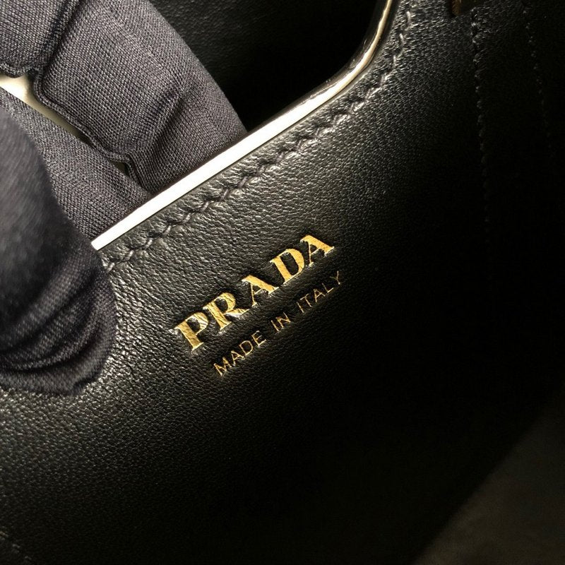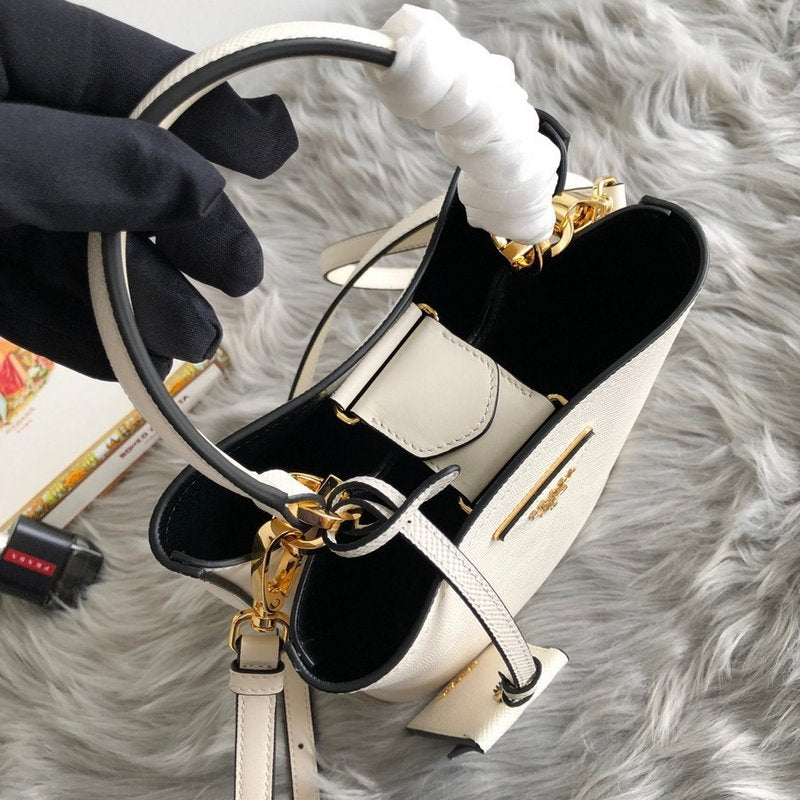 스몰 사이즈이지만 견고한 구조와 고급스러운 사피아노 레더 소재가 어우러져 정돈된 인상을 줍니다. 중앙에는 프라다의 메탈 로고 플레이트가 포인트로 배치되어 있으며, 더블 핸들과 함께 탈부착 가능한 숄더 스트랩이 구성되어 다양한 스타일링이 가능합니다.