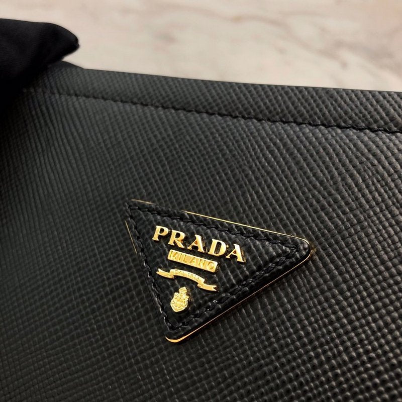 이 백은 미니멀하고 직선적인 구조에 골드 또는 실버 톤의 메탈 디테일이 어우러져 심플하면서도 세련된 분위기를 연출합니다. 프라다의 상징적인 삼각 로고 메탈 플레이트가 전면에 위치해 브랜드 아이덴티티를 강조하며, 플랩 없이 열고 닫는 구조로 사용이 간편합니다.