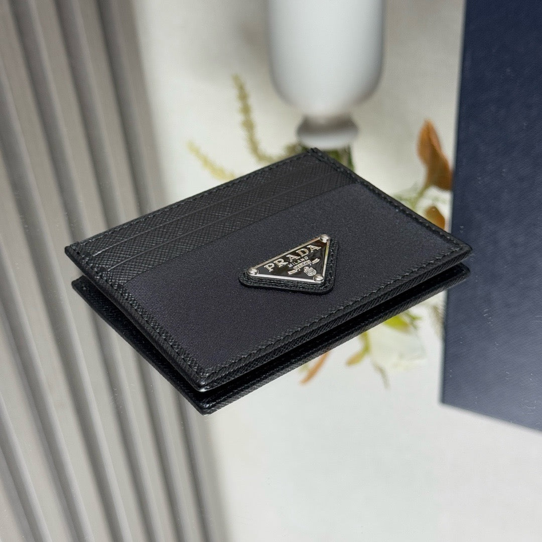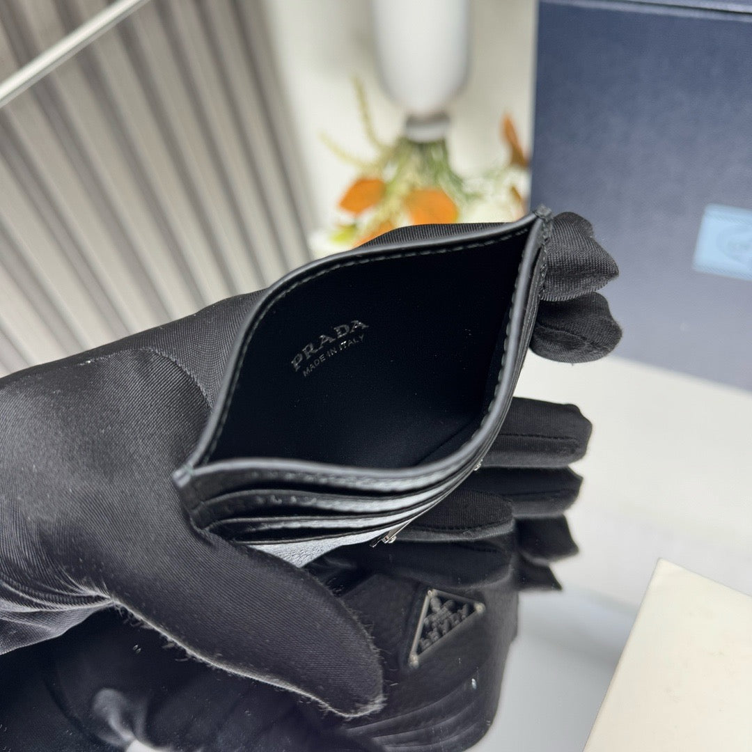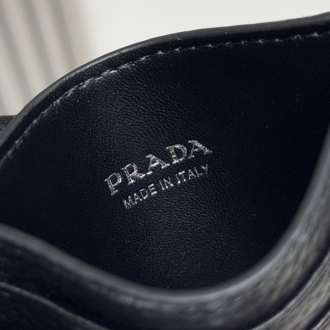 이 카드지갑은 프라다의 대표 소재인 사피아노 레더 또는 소프트 럭스 카프스킨으로 제작되어 내구성과 고급스러움을 동시에 제공합니다. 전면의 삼각 메탈 로고는 프라다의 정체성을 강하게 드러내는 핵심 요소이며, 전체적인 실루엣은 슬림하고 모던한 직사각형 형태로 구성되어 있습니다.