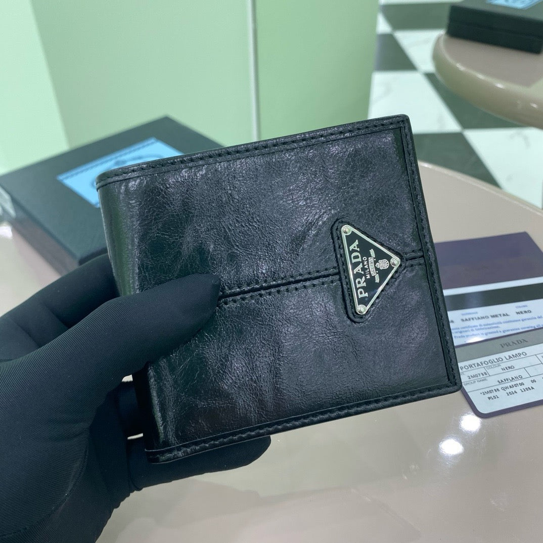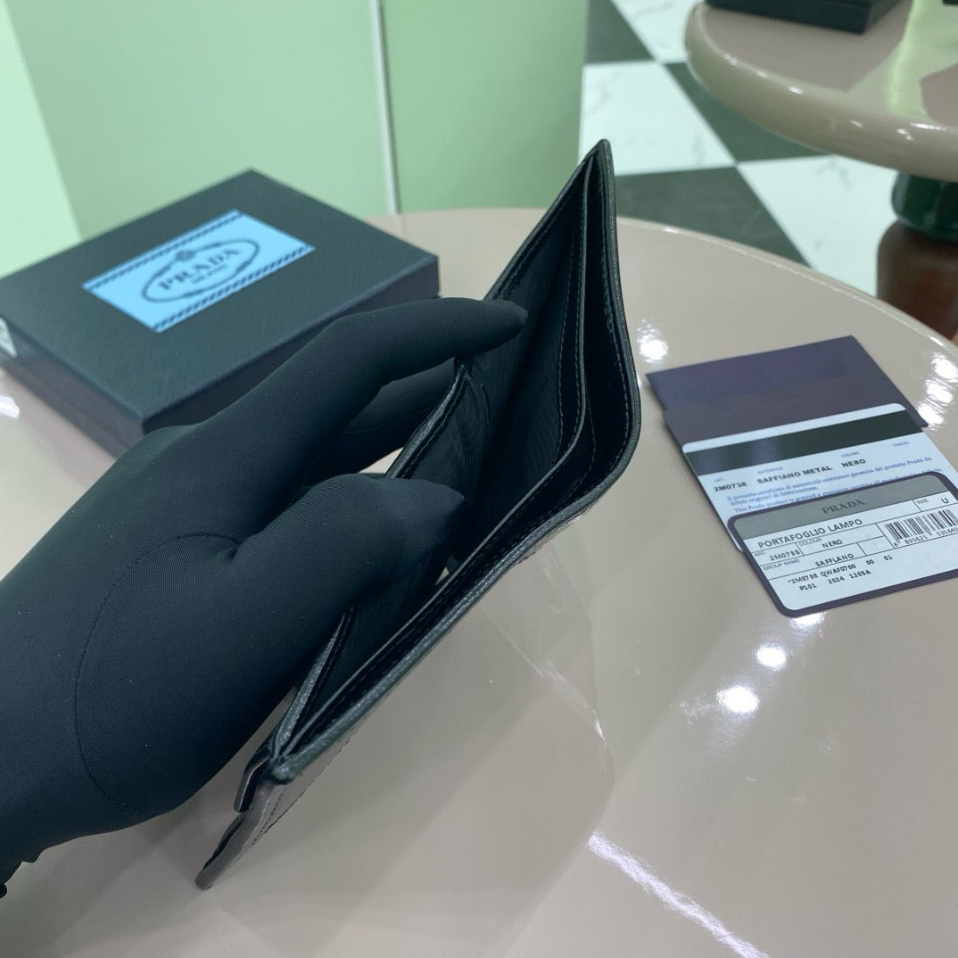 이 반지갑은 프리미엄 소프트 럭스 카프스킨으로 제작되어, 은은한 광택과 함께 고급스러운 질감을 자랑합니다. 프라다의 메탈 로고가 전면에 포인트로 장식되어 있어 브랜드의 아이덴티티를 강조합니다.