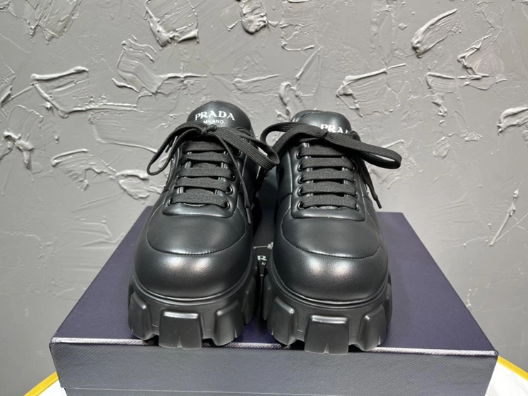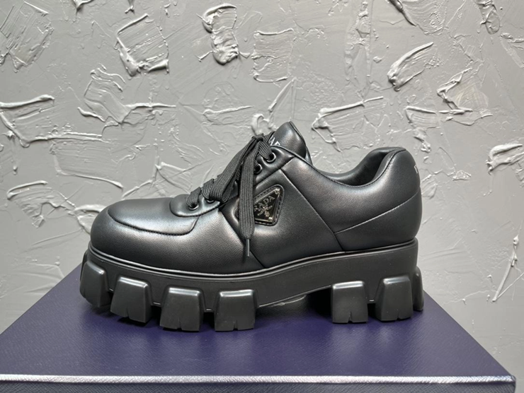 패딩 처리된 나파 가죽의 독특한 질감과 프라다의 삼각 로고 디테일, 그리고 편안한 착화감이 특징인 고급 캐주얼 슈즈입니다.