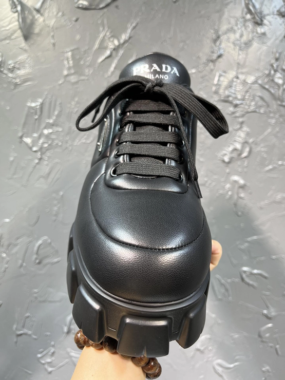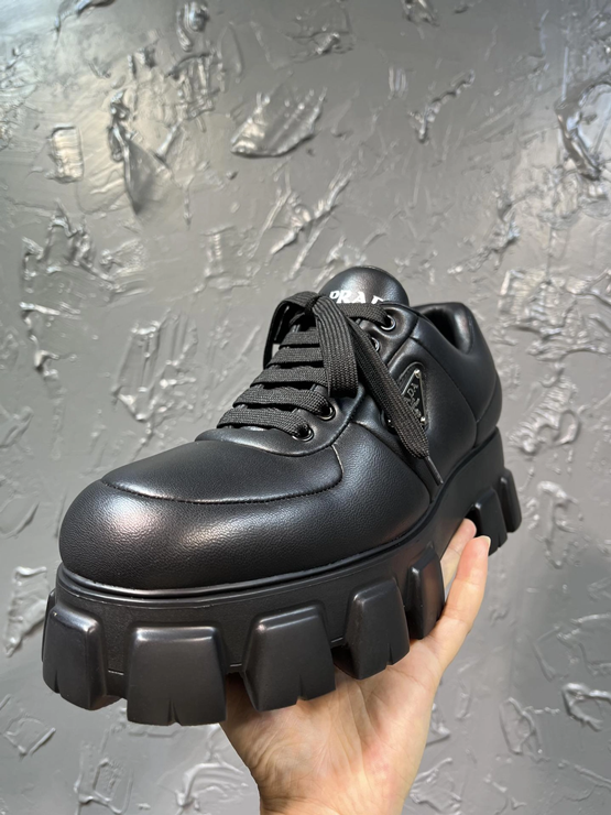 이 슈즈는 푹신한 패딩 처리된 나파 가죽 어퍼로 구성되어 독특한 볼륨감과 시각적인 임팩트를 동시에 선사합니다. 프라다 특유의 삼각 로고가 측면에 세련되게 배치되어 고급스러운 분위기를 더하며, 전체적인 실루엣은 모던하면서도 스포티한 감각을 강조합니다.