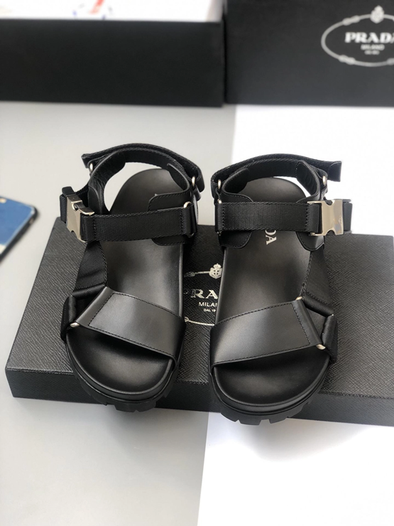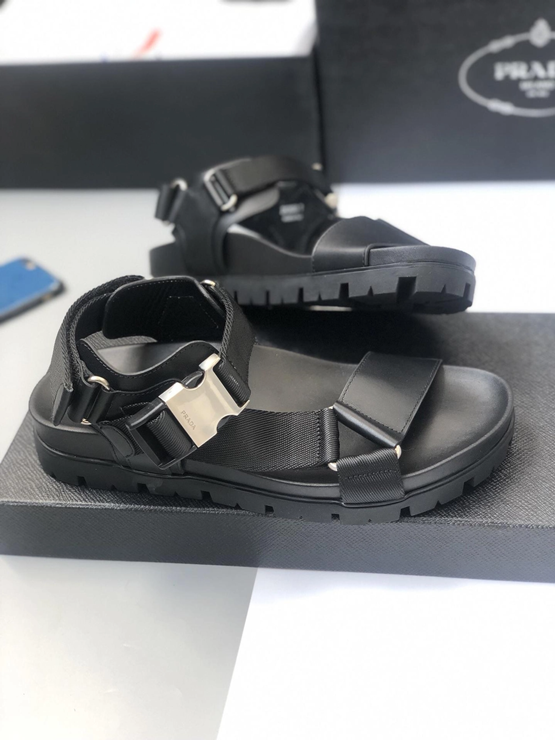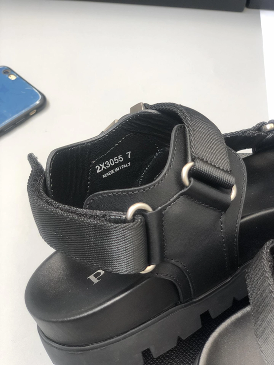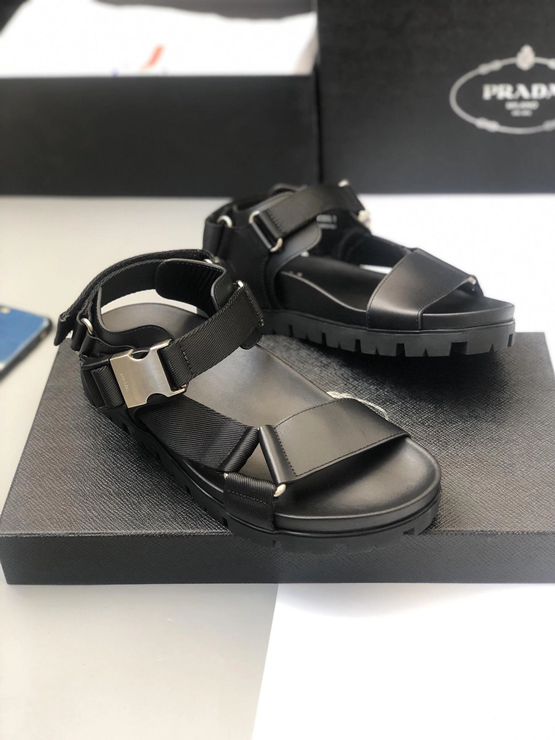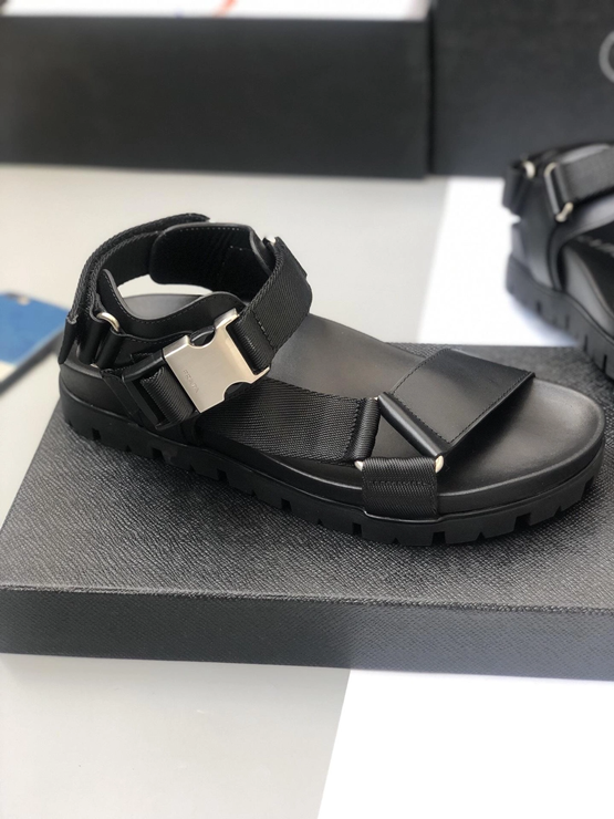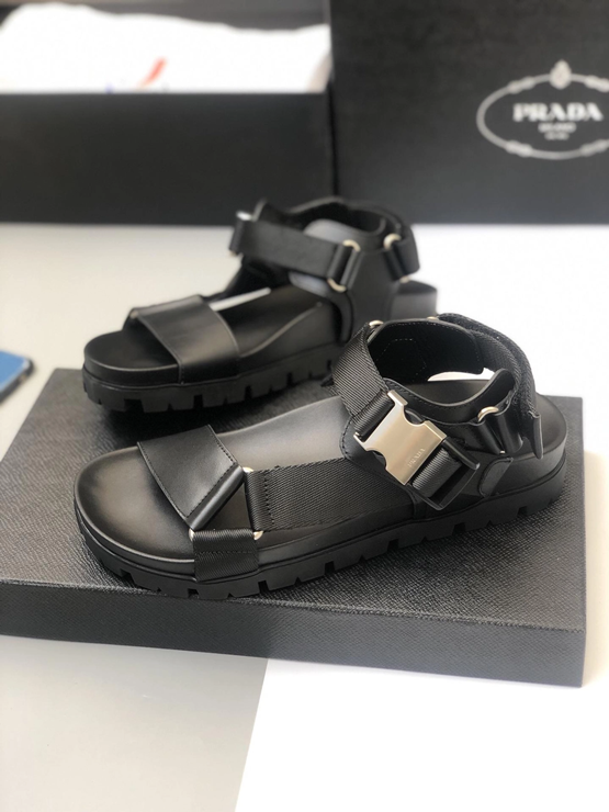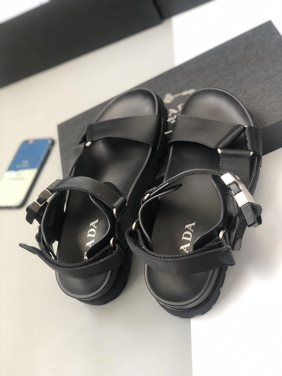 이 샌들은 가죽과 나일론 테이프를 조합한 스트랩 디자인이 특징이며, 견고하면서도 유연한 소재로 편안한 착용감을 제공합니다. 발등과 발목을 안정감 있게 잡아주는 구조로 활동성이 뛰어나며, 프라다 로고가 스트랩 또는 인솔에 디테일로 포함되어 고급스러운 감각을 더합니다.