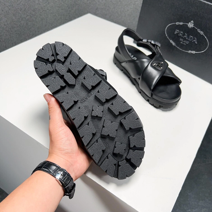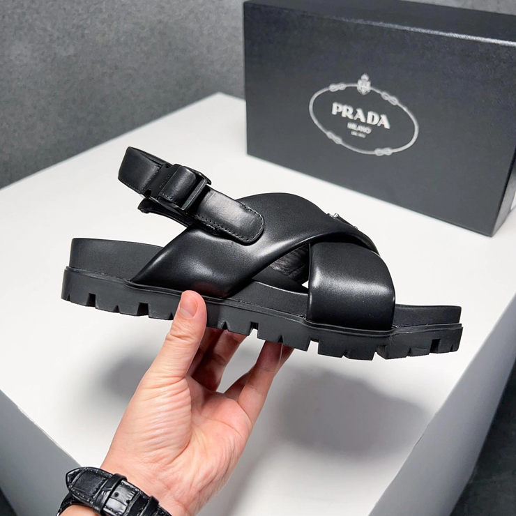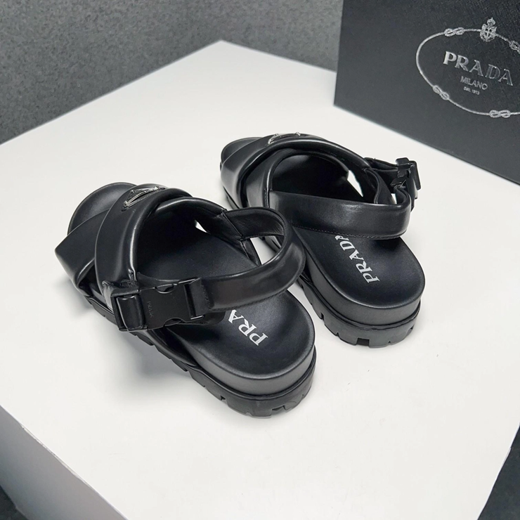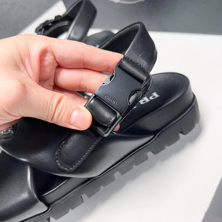 이 샌들은 유연한 나파 가죽을 패딩 처리하여 부드러운 착화감과 고급스러운 외관을 동시에 제공합니다. 크리스크로스 구조의 스트랩이 발등을 안정적으로 감싸며, 인솔 또는 스트랩에 프라다 로고 디테일이 삽입되어 브랜드의 정체성을 더합니다.