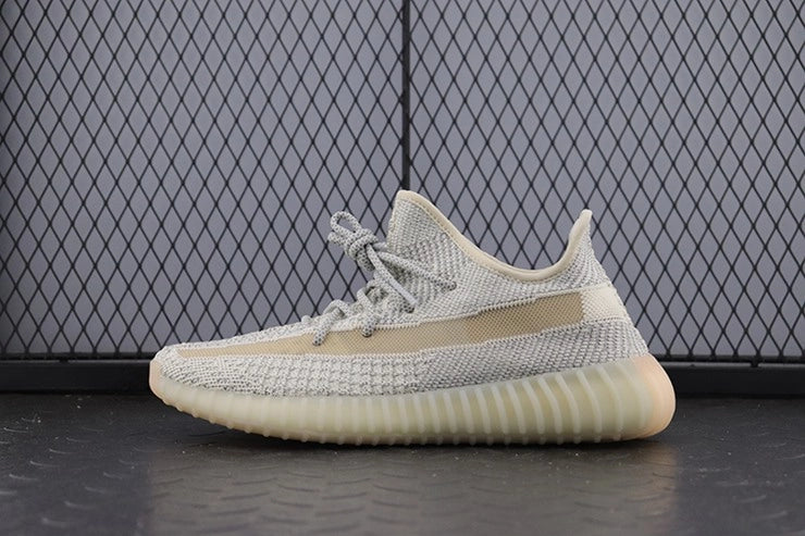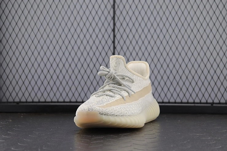 YEEZY BOOST 350 V2 룬드마크 리플렉티브는 베이지, 오트밀, 라이트 그레이 계열의 프라임니트 어퍼에 전체적으로 반사 소재가 섞여 있어, 빛을 받으면 은은하게 빛나는 시각적인 효과를 연출합니다. 측면에는 반투명 스트라이프 디테일이 적용되어 전체적인 균형을 더합니다.